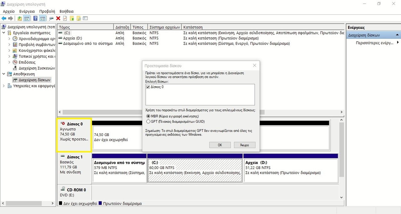 Τέρης Α. Δημοσ. 27 Απριλίου 2020 Δημοσ. 27 Απριλίου 2020 (επεξεργασμένο) Έβγαλα το δίσκο του PS3 (320GB) να ελέγξω την υγεία του στον υπολογιστή και κατά λάθος στη διαχείριση δίσκων (Windows 10x64) του έκανα προετοιμασία δίσκου με αποτέλεσμα να μη διαβάζεται το λειτουργικό. Αυτό που θέλω είναι αν γίνεται αντιστροφή της ενέργειας ή κάτι τέτοιο για να μου τον αναγνωρίσει, καθώς δεν έχω κρατήσει αντίγραφο ασφαλείας. Κάτι τέτοιο έκανα, μόνο που στο κίτρινο κουτάκι φανταστείτε το δίσκο του PS3. Το ''Προετοιμασία δίσκου'' δε πρόλαβα να το δω. Και μου εμφανίζει αυτό το PS3 Επεξ/σία 27 Απριλίου 2020 από Τέρης Α.