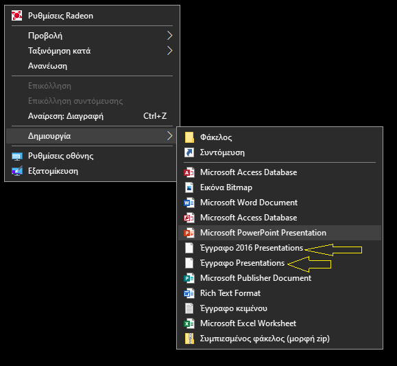 nikoskon Δημοσ. 5 Μαΐου 2020 Δημοσ. 5 Μαΐου 2020 Θέλω να εξαφανίσω αυτές τις 2 επιλογές όταν στην επιφάνεια εργασία κάνω δεξί κλικ / Δημιουργία (right click/New). To Softmaker Freeoffice έχει πλέον επεγκατασταθεί (στο οποίο ανήκει η εφαρμογή Presentations). Με regedit και διάφορα "βοηθητικά" software δεν έβγαλα άκρη. Μπορεί κάποιος να βοηθήσει;