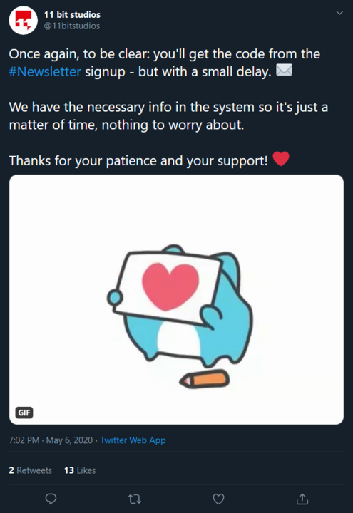 kamui Δημοσ. 6 Μαΐου 2020 Δημοσ. 6 Μαΐου 2020 (επεξεργασμένο) 5 ώρες πριν, God είπε Έχει πέσει. Μπείτε από την κερκόπορτα: https://11bitstudios.us13.list-manage.com/subscribe?u=07cb1cf5701271eb987ebe16b&id=ca1f87886f Ευχαριστούμε TS. Θεός! μου έδωσε αμέσως κλειδάκι. Το αρχικό Link είναι dead ώρες τώρα. Επεξ/σία 6 Μαΐου 2020 από kamui 1