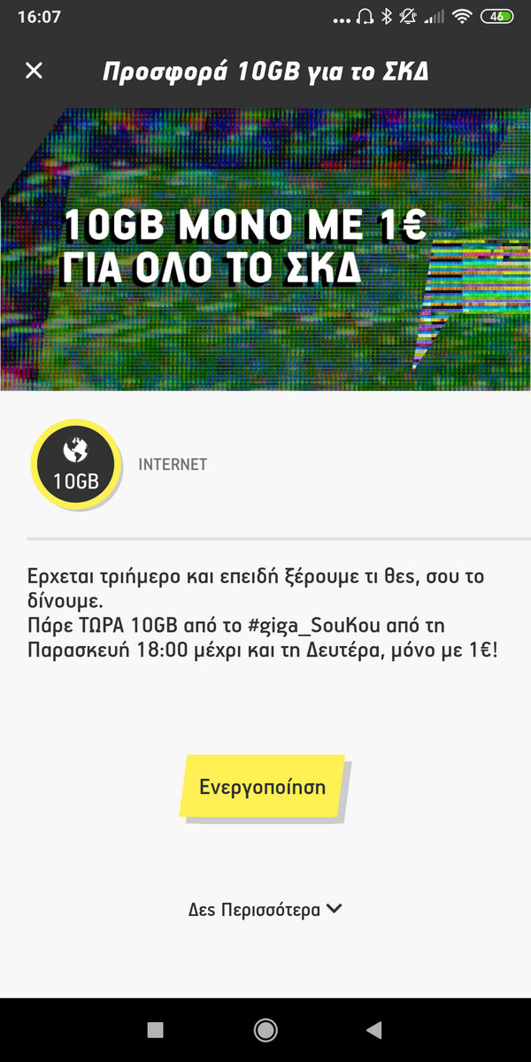 vgolden Δημοσ. 5 Ιουνίου 2020 Δημοσ. 5 Ιουνίου 2020 (επεξεργασμένο) Guys, το έβαλα το 10Gb ΠΣΚΔ (από Παρ. 00:01 έως Δευτ. 23:59) αλλά στο cosmote mobile app δε δείχνει τπτ. Δε καταναλώνει τα Gb του κανονικού πακετου (αρα έχει ενεργοποιηθει) αλλά δε φαίνεται και το υπόλοιπο από τα 10Gb.... Επεξ/σία 5 Ιουνίου 2020 από vgolden