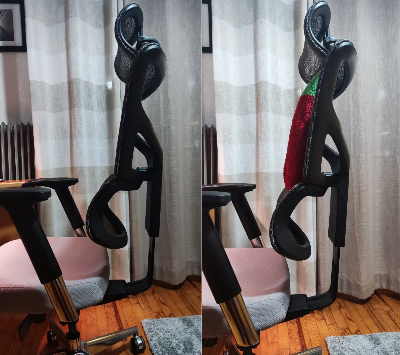 Το θέμα υποστήριξης μέσης είναι επίσης υποκειμενικό πιστεύω. Τον πρώτο χρόνο που την χρησιμοποιούσα δεν καθόμουν και αρκετές ώρες οπότε μου φαινόταν κουλ! Τον δεύτερο χρόνο καθόμουν υπερβολικά πολλές ώρες λόγω μεταπτυχιακού και άρχισα να έχω πόνους στη μέση, πήγα σε γιατρό κλπ. Φέτος που δουλεύω εξ' αποστάσεως έχω βάλει ενα μικρό μαξιλαράκι να "ομαλύνει " λιγάκι το απότομο κόψιμο για τη θέση της μέσης (επισυνάπτω και δύο φωτογραφίες με το color blocking χριστουγεννιάτικο μαξιλαράκι μου για να καταλάβεις😂). Υποθέτω στον επόμενο χρόνο θα πάρω μια καινούρια η οποία θα έχει και προσαρμοσμένο βάθος καθίσματος και πιο ήπια καμπύλη για τη μέση.