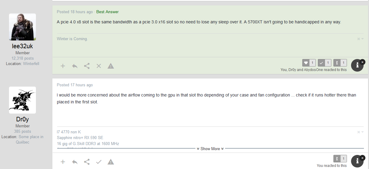 ilos Δημοσ. 13 Ιουνίου 2020 Δημοσ. 13 Ιουνίου 2020 10 λεπτά πριν, Lfc είπε Αυτό ακριβώς ήθελα να πω και δεν έβρισκα τον τρόπο και τα λόγια. Ευχαριστώ 🤩 Γι'αυτό ακριβώς έβαλα την sapphire κάτω. Αν την έβαζα πάνω το σκέπαζε όλο το fan. Τώρα είναι τελείως ελεύθερο. Ειλικρινά δεν το έχω ακούσει ακόμα να δουλεύει. Ανοίγω το τζαμί στο Corsair Carbide 540 Air πλησιάζω σε απόσταση αναπνοής και δεν ακούγεται👂τίποτα ...Για να δούμε τώρα το καλοκαίρι αν έρθει κανένας καύσωνας. Κάτω είναι συνδεδεμένη με x8. Αλλά από την στιγμή που είναι gen4 κάρτα είναι σαν να έχει συνδεθεί x16 gen3 οπότε klein mein. Δεν έχουμε όμως όλοι navi, και να κόψουμε τα lanes στα μισά θα έχει επίπτωση στις επιδόσεις (έστω και μικρή) σε gen3 κάρτες. 1 1