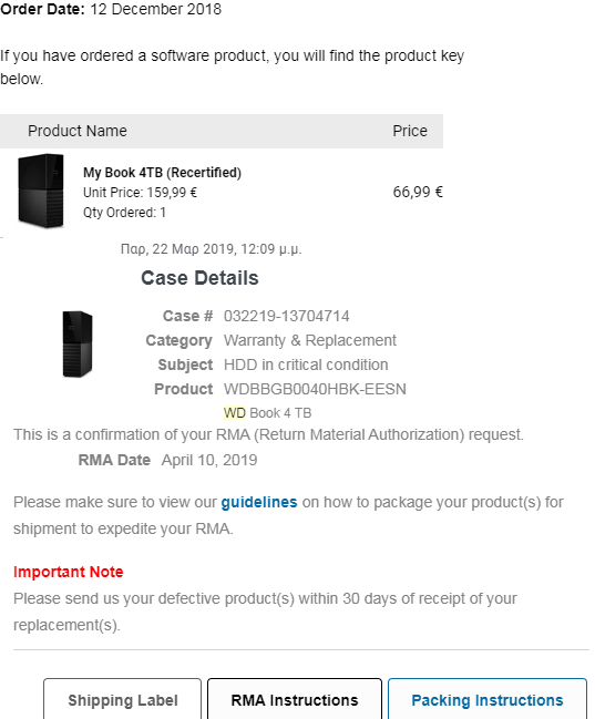 neosstoforum Δημοσ. 19 Ιουνίου 2020 Δημοσ. 19 Ιουνίου 2020 (επεξεργασμένο) Δε ξέρω τι εννοούν με την έννοια "Recertified" (δηλαδή αν είναι επισκευασμένα ή απλά μεταχειρισμένα) αλλά η τιμή είναι αρκετά χαμηλή για 3TB. Δίνουν και 1 χρόνο εγγύηση. https://shop.westerndigital.com/el-gr/products/external-drives/wd-my-book-usb-3-0-hdd-recertified Για να έχετε τη τιμή του τίτλου θα πρέπει να κάνετε εγγραφή στο newsletter και μετά από λίγο θα σας έρθει ένα mail με τον κωδικό που πρέπει να προσθέσετε στο checkout. Τα μεταφορικά είναι δωρεάν. Επεξ/σία 19 Ιουνίου 2020 από neosstoforum