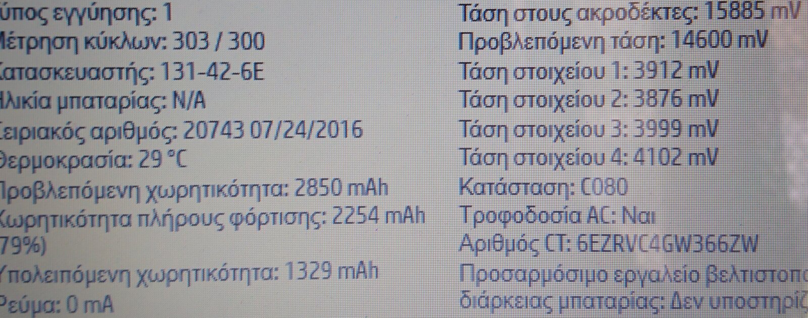 arxyat Δημοσ. 22 Ιουνίου 2020 Μέλος Δημοσ. 22 Ιουνίου 2020 Στις 21/6/2020 στις 1:22 ΜΜ, sstratos είπε Η μπαταρια κρατάει φορτίο ? δηλαδη χωρις φορτιστή πόση ωρα κρατάει αναμένο το λαπτοπ ?? επισης μπορεί να εχουν οξειδωθει οι επαφές της και οχι να εχει χαλάσει... εγκατεστησε το hwmonitor και κοιτα την κατασταση της μπαταριας σου για αρχή Voltage 14.762 designed capability 41610 Full charge capability 28514 (100%) Current capability 19287 (67%) Wear level 32% (αυτό δεν ξέρω καν τι είναι) Αυτά είναι τα δεδομένα.. Αν δεν σου είναι κόπος ενημέρωσε με αν διακρίνεις κάποιο πρόβλημα...