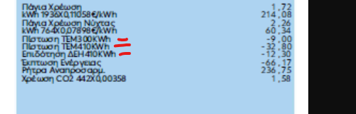 Τα αρνητικά ποσά που έχεις σημειώσει ("Ταμείο Ενεργιακής Μετάβασης") είναι η επιδότηση (ανά μήνα). Η "εκπτωση ενέργειας" είναι η έκπτωση 30% της ΔΕΗ (επί της "βασικής τιμής κιλοβατώρας", δηλ. το "0,11")  για το Γ1 από αρχές Αυγούστου.