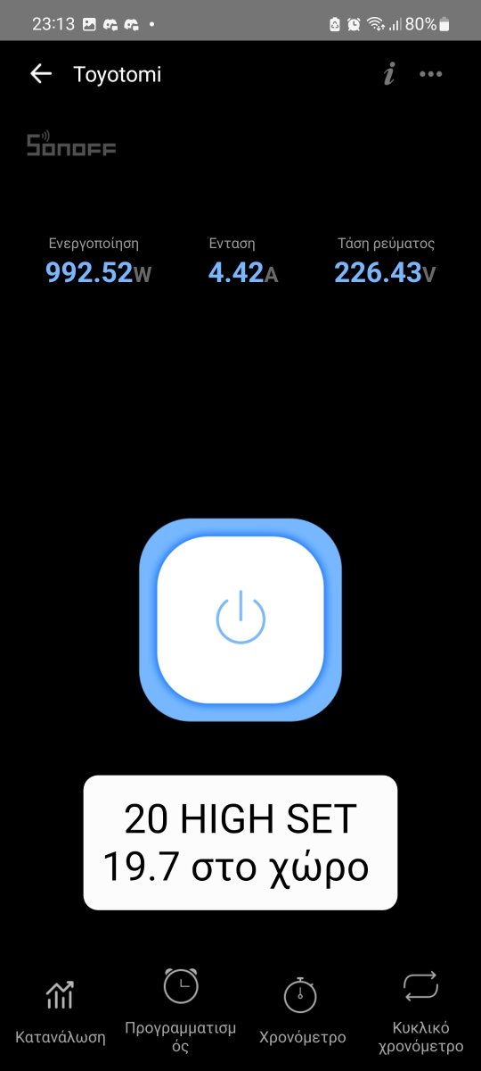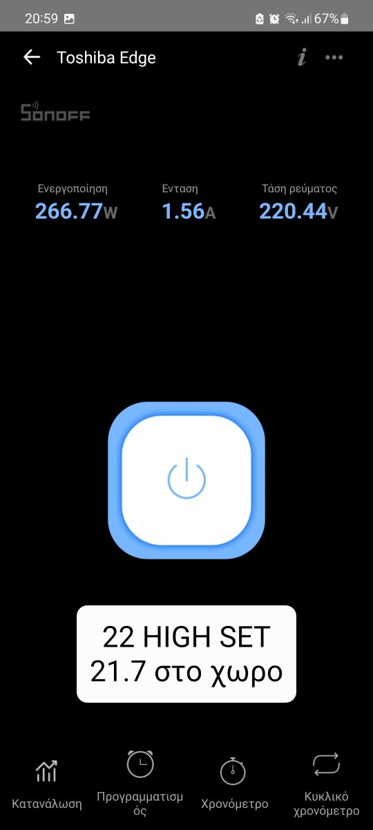 Σήμερα μετά από πολύ καιρό νιώθω επιτέλους χαλαρός μιας και ξηλωθηκε το έξω από δω toyotomi izuru eco II και μπήκε στη θέση του το Toshiba edge. Και τα 2 18αρια. Με πολλές επιφυλάξεις μιας και φοβόμουν ότι δεν θα επαρκεί για το χώρο αν και μέσα από τους υπολογισμούς εδώ για 18αρι πηγαίναμε και με οφείλω να πω την βοήθεια του @liakjim κυρίως αλλά και με πολλά παιδιά από εδώ μέσα έγινε η εγκατάσταση.επισης μπήκε και ένα midea xtreme save lite 12 στον ίδιο χώρο με σκοπο να βοηθήσει το toshiba( περισσεύε απο αλλο σπιτι που ειχε μπει στο εξ οικονομω)Όλα προβλεπε σωληνώσεις κενά τα πάντα άριστα. Το σπιτι ειναι 70τμ και χωρις μονωση και κουφώματα.  Πλάκα από πάνω χωρίς κάποια μονωση και ανοιχτά σχετικά γύρω γύρω. Περιοχή Βέροια με εξωτερικη σήμερα στους 10 βαθμους.οι μετρήσεις είναι στις ίδιες συνθήκες χωρίς να δουλεύει το midea και αφού έπιανε θερμοκρασία ο χώρος στην θερμοκρασία επιλογής. Η διαφορά.... στα παρακάτω.Screenshot_20221205-205909_eWeLink.jpg.b88abad21189f4a2cc6c7663b3c3bee5.jpg