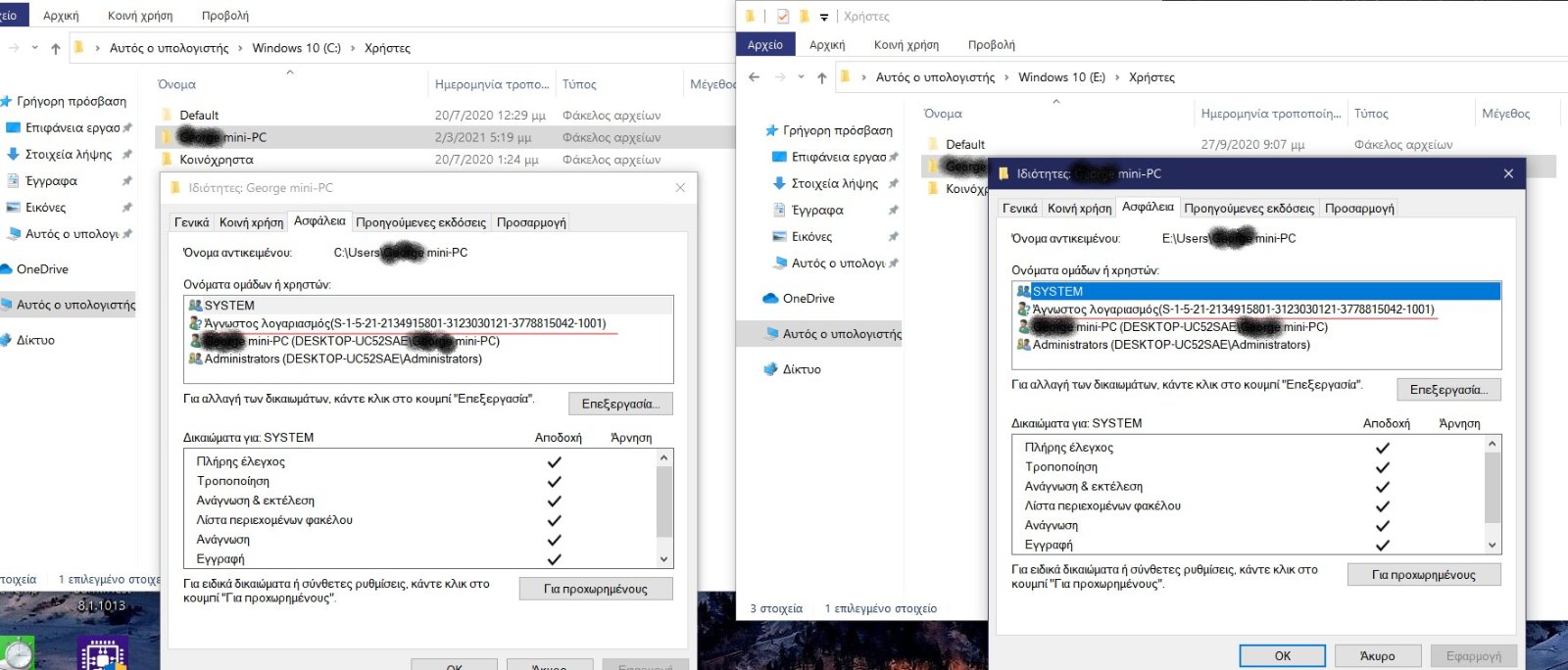 giokspy Δημοσ. 5 Αυγούστου 2020 Δημοσ. 5 Αυγούστου 2020 Καλησπέρα. Έχω σε κάποιος pc δίπλα windows σε διαφορετικούς δικούς. Παλιότερα 7 κ 10 τώρα μόνο δεκαριά τα οποία εναλλασω για διαφορετικές χρήσεις. Μου έχει συμβεί αρκετές φορές να κάνει check disk και να αλλάζουν 5α δικαιώματα σε ένα από τους δύο δίσκους , συχνά να καταστρέφεται ο κάδος ανακύκλωσης. Δοκίμασα από τις ιδιότητες/ ασφάλεια να επαναφέρω το user και authenticated user αλλά πάλι δεν ξεκινάει. Καμμιά ιδέα μήπως και το γλυτώσω αυτή τη φορά μιας και είναι partition εργασίας?