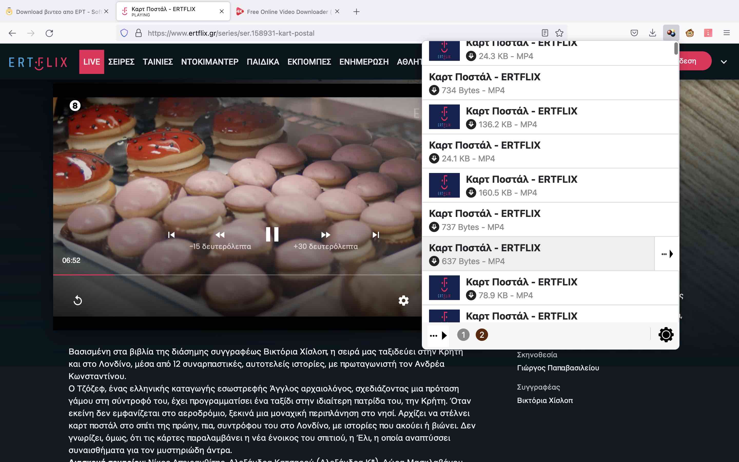 Patrick007 Δημοσ. 24 Νοεμβρίου 2021 Δημοσ. 24 Νοεμβρίου 2021 (επεξεργασμένο) Παιδία σίγουρα έχει αναφερθεί πάρα πολλές φορές αυτο το θέμα επομενως ζητώ συγνώμη εκ των προτέρων απλώς προσπαθώ εδω και ώρες να κατεβάσω το 7ο επεισόδιο της Καρτ Ποσταλ απο ERTFLIΧ και δεν βγάζω καθόλου άκρη!! Χρησημοποιώ Μac OS. Προσπάθησα και με το Video Download Helper με mozilla αλλά και με chrome και ενώ μου βγάζει όντως διάφορα να κατεβάσω (όπως στην φωτογραφία παρκάτω) όλα φαίνονται να είναι πολυ μικρά αρχειάκα γύρω στα 600 bytes με 800 ΚΒ, δηλαδή σίγουρα δεν έχει πιάσει το βίντεο ολόκληρο. Δεν έχω καταλάβει γιατί! Έχω προσπαθήσει και με άλλα όπως το https://youtube4kdownloader.com/ και δεν μου βγάζει τίποτα... αναρωτιέμαι μήπως δεν έχω βάλει το σωστό URL? Ίσως να μου λείπει κάποιο κολπάκι. Οποιαδήποτε βοήθεια ή διευκρίνιση εντελώς ευπρόσδεκτη!! Επεξ/σία 24 Νοεμβρίου 2021 από Patrick007