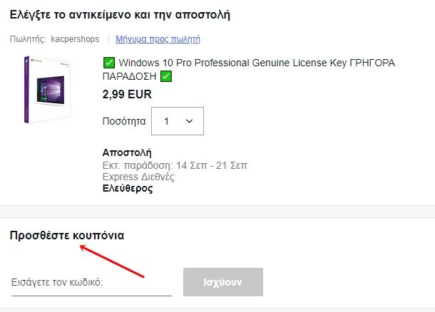 hp8 Δημοσ. 12 Σεπτεμβρίου 2020 Δημοσ. 12 Σεπτεμβρίου 2020 29 λεπτά πριν, lefteris03 είπε Καλησπέρα, προσπαθώ να αγοράσω μια φθηνή άδεια Windows 10 Pro από το ebay, αλλά μου ζητάει να προσθέσω κουπόνια. Που θα το βρω αυτό και γενικά πώς γίνονται οι αγορές στο ebay? προφανώς γι αυτήν την τιμή θέλει κάποιο κουπόνι Αν το παρακάμψεις αυτό και πας σε αγορά τι βγάζει Βάλε τον σύνδεσμο που παραπέμπει στη φωτο