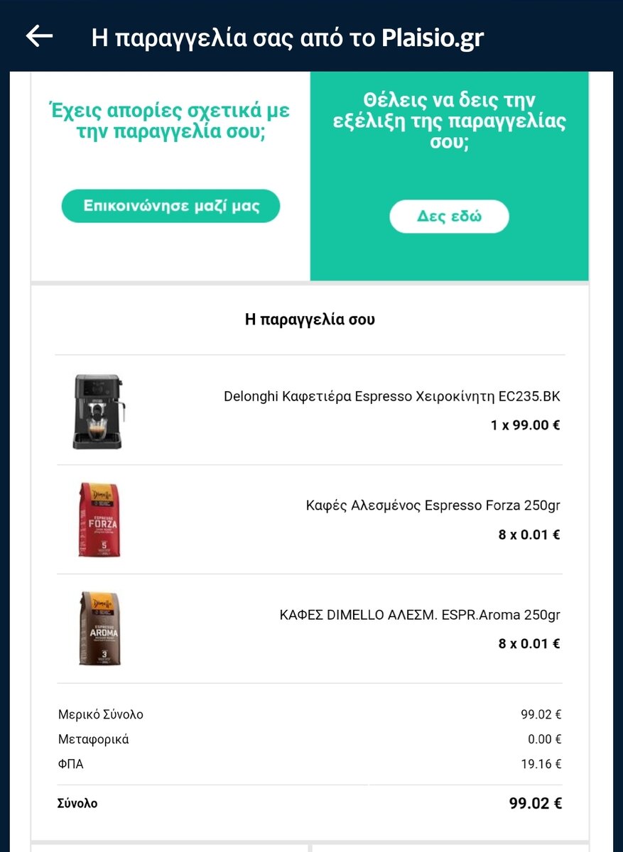 Μολις παρειγγειλα κι εγω τη Delonghi αλλα στη παραγγελια εμφανιζεται μονο η μηχανη (ενω στο eshop συνεχιζε να εμφανιζει τη προσφορα για τους καφεδες δωρο). Μηπως ενημερωνεται η παραγγελια στη πορεια και εμφανιζει και τους καφεδες?