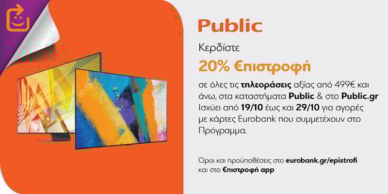 Narayan Δημοσ. 19 Οκτωβρίου 2020 Δημοσ. 19 Οκτωβρίου 2020 20% €πιστροφή Eurobank σε όλες τις τηλεοράσεις αξίας από €499 και πάνω, για αγορές στα Public από 19/10 έως και 29/10 και με χρήση καρτών που συμμετέχουν στο πρόγραμμα. Κοίταξα για φθηνή 65άρα και οι περισσότερες ήταν στα χαμηλότερα επίπεδα τιμών Skroutz, επίσης καλή ευκαιρία είναι η 65άρα της Xiaomi με Android 9 στα €598 προ Επιστροφής (€478 μετά την Επιστροφή). https://www.public.gr/product/tileoraseis/tileoraseis/tileorasi-xiaomi-mi-65-smart-led-4k-uhd-4s65eu/prod11620132pp/ 1