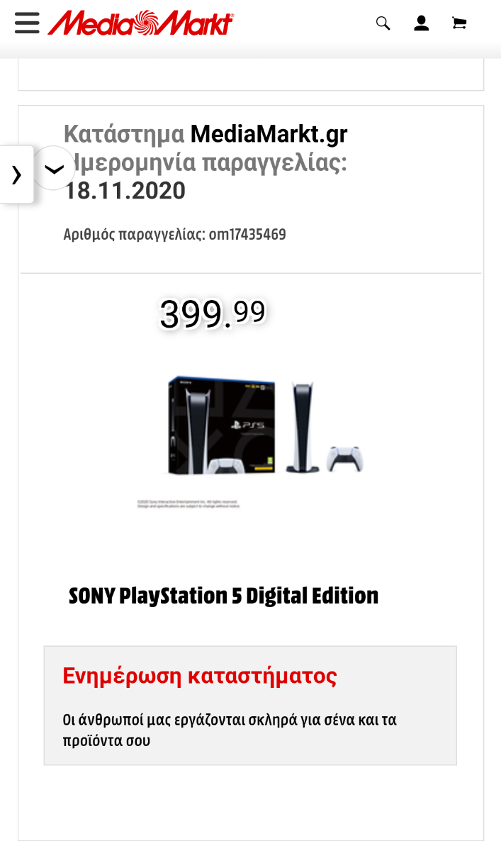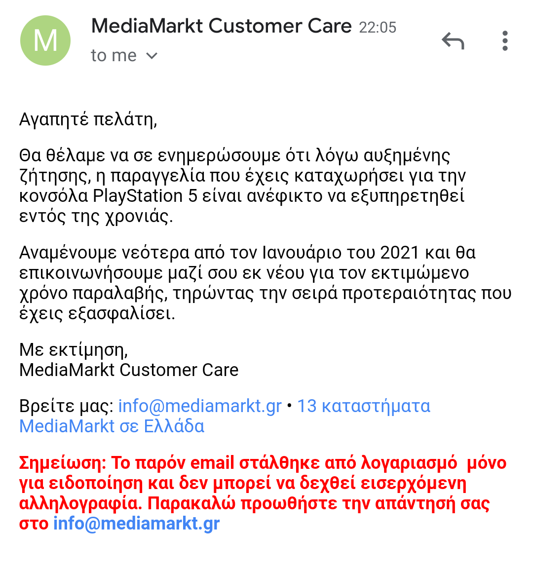 Πήρα μήνυμα ακόμα και γω που το έχω ακυρώσει από τα Media Markt. Αν και φαίνεται καταχωρημένο ακόμη παρόλο που η ακύρωση δρομολογήθηκε εδώ και τουλάχιστον 2 βδομάδες. Και μάλιστα έχει επιβεβαιωθεί και με γραπτή επικοινωνία μαζί τους στο fb. Mail/support από τη σελίδα ΔΕΝ απαντάνε ΠΟΤΕ