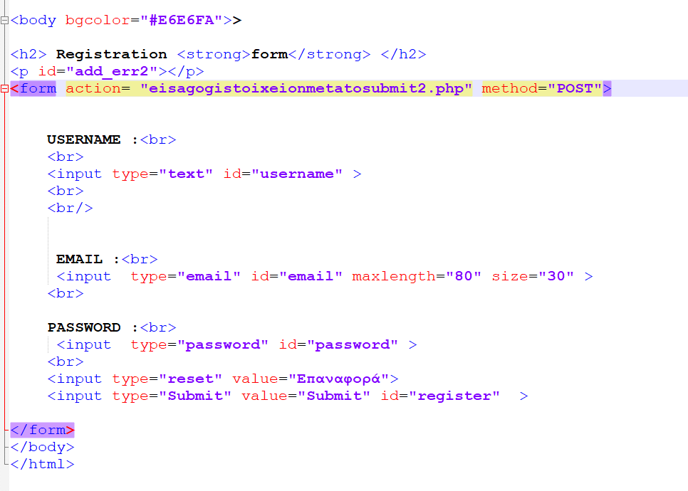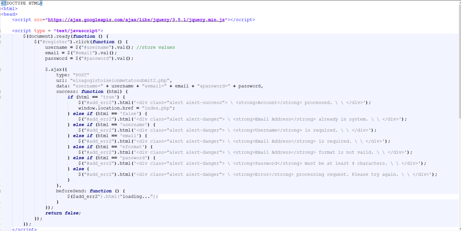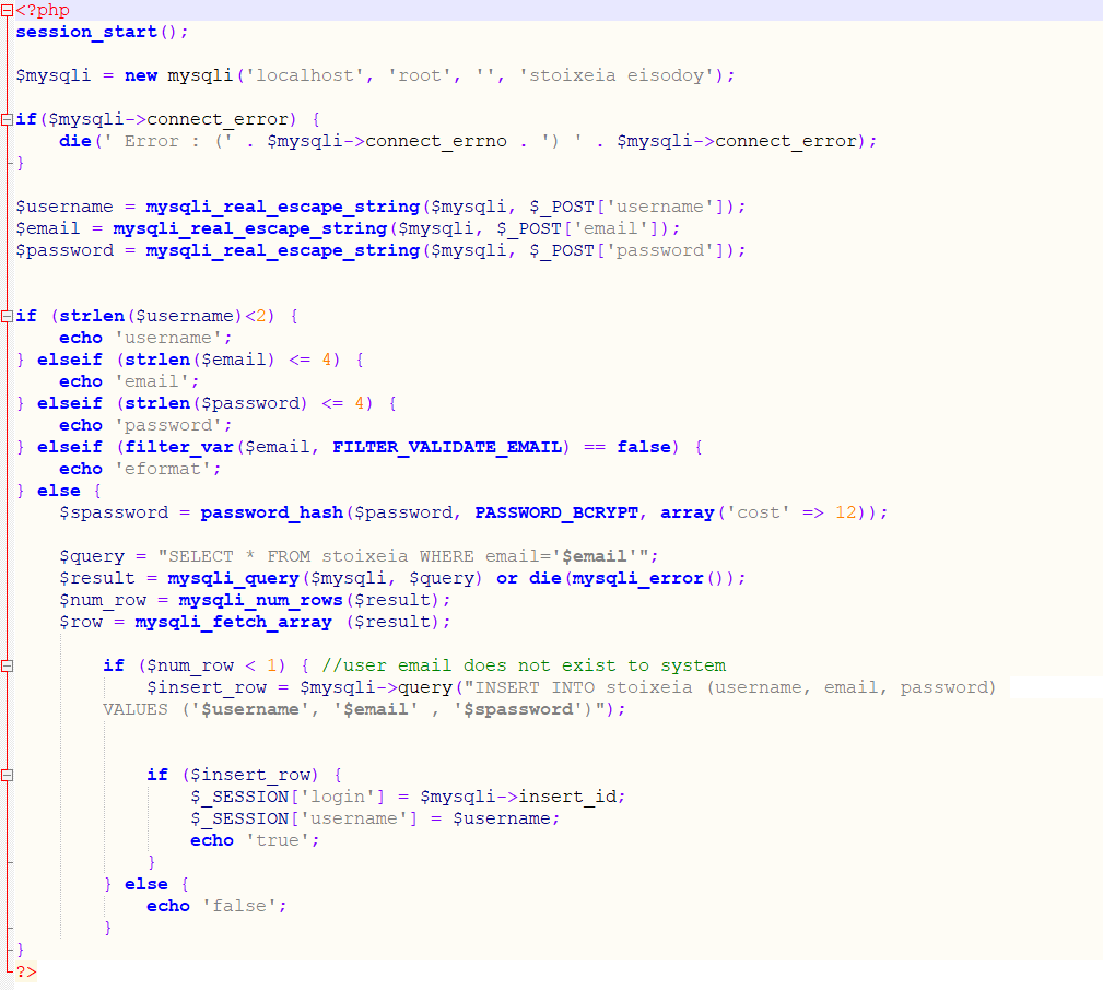 oraiustepe Δημοσ. 19 Νοεμβρίου 2020 Δημοσ. 19 Νοεμβρίου 2020 Καλησπέρα. Έχω το εξής πρόβλημα. όπως βλέπεται στο αρχείο "eisagogi arxeion meta to submit" έχω ενα if statement το οποίο κάθε echo του πρέπει να πηγαίνει στο αντίστοιχο ajax if (αρχείο form) και να τυπώνει ανάλογα. Π.χ αν ο χρήστης βάλει username μικρότερο από δύο χαρακτήρες να πηγαίνει μέσα στον κώδικα του ajax και να μπαίνει στην συνθήκη "else if (html == 'username') " και να τυπώνει username is required. Αλλά όλη αυτή η διαδικασία σκαλώνει και δεν επικοινωνούν τα δύο αρχεία. Τα αρχεία βρίσκονται ακριβώς στο ίδιο Location. Υπάρχει κάποιο λάθος στον κώδικα ajax ή στο php Που μου διαφεύγει. Υ.Γ η εντολή "$("#register").click(function () {" (το register είναι id στο submit input type της φόρμας") (<input type="Submit" value="Submit" id="register" > ) Οποιαδήποτε βοήθεια ευπρόσδεκτη, σόρρυ αν κάτι είναι δυσνόητο είμαι σε αρχάριο level ακόμα. Ευχαριστώ εκ των προτέρων