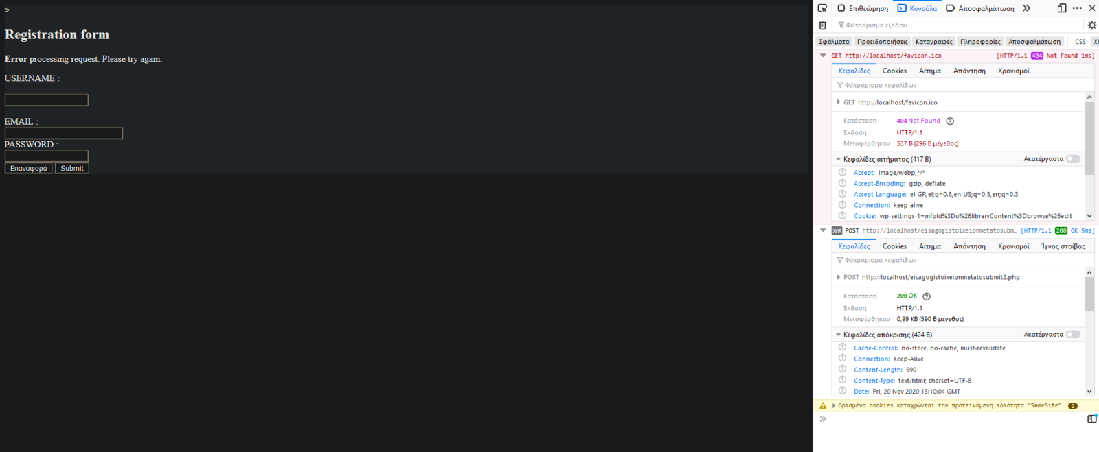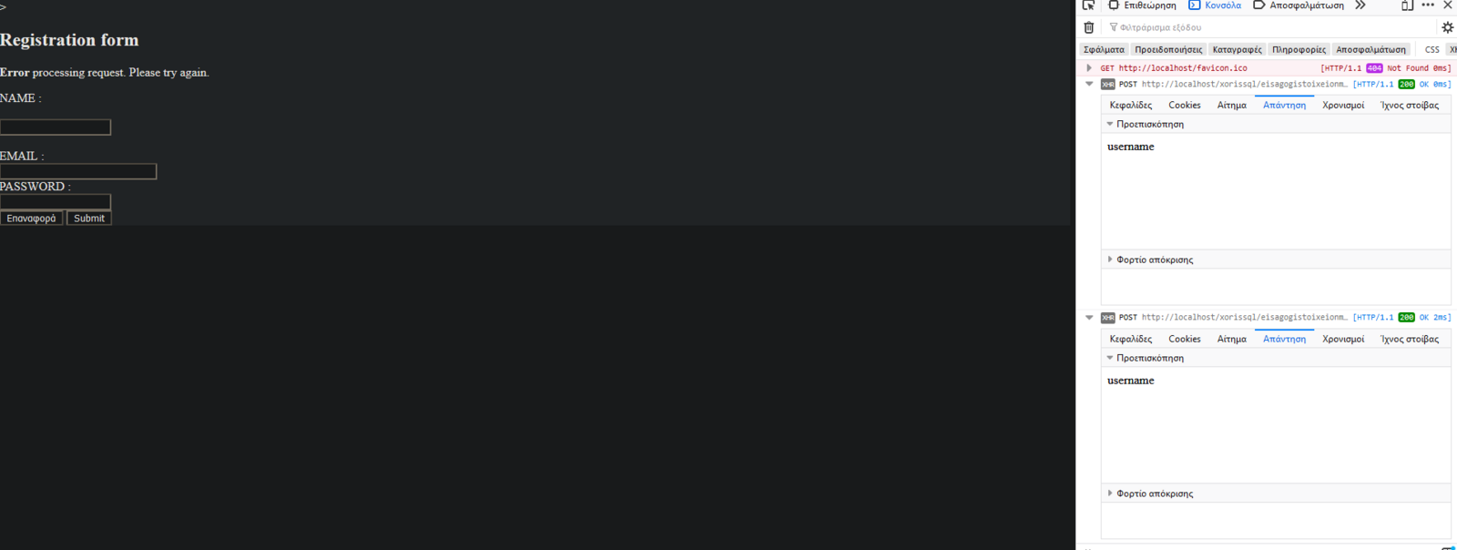 oraiustepe Δημοσ. 20 Νοεμβρίου 2020 Μέλος Δημοσ. 20 Νοεμβρίου 2020 17 ώρες πριν, Ponous είπε Έχω δοκιμάσει αυτό που έγραψες χωρίς όμως όλα αυτά τα ifs και χωρίς mysqli διότι ήθελα να ελέγξω πως επικοινωνούν κι όχι τι γίνεται αφού επικοινωνήσουν. Το πρώτο που είδα είναι πως ξέχασες να βάλεις ',' (κόμμα) μετά το type: "POST" Το άλλο, δοκίμασε να τρέξεις κάπου την πιο κάτω εντολή για να βλέπεις τι επέστρεψε. Αν έχει επιστραφεί κάτι θα το δεις στην κονσόλα σου (web developer tools, console) console.log(html) Σε μένα επικοινωνούν μια χαρά έτσι όπως το έκανες εκτός από το σημείο με το POST. Είχα και τα 2 αρχεία στον ίδιο φάκελο. Άνοιξε την κονσόλα σου και πες μας τι σου γράφει. Πάτησε το κουμπί "xhr" για να βλέπεις τα ajax requests που γίνονται. Ακολούθως πες μας τι σου επιστρέφει. Αν επιστρέφει κάτι, σημαίνει πως υπάρχει επικοινωνία και κάτι άλλο φταίει. Αν δεν επιστρέφει κάτι αλλά βλέπεις πως όταν πάτησες το κουμπί στην κονσόλα έγραψε πως έγινε κάποιο xhr request, τότε υπάρχει επικοινωνία αλλά δεν επιστρέφεις τίποτα. Αν δεν γράφει κάτι τότε σημαίνει πως δεν γίνεται το ajax request (άρα κάποιο λάθος έχει το js script σου). Αν γίνεται το ajax request και είναι 500 τότε μάλλον δεν βρίσκει το αρχείο σου ή τα έπαιξε κάποια βιβλιοθήκη που χρησιμοποιείς (π.χ. mysqli) Τώρα με κάποιες αλλαγές που έκανα ότι και να βάλω στην φόρμα επιστρέφει το τελευταίο statement του ajax, δηλαδή error processing request στα υπόλοιπα δεν μπαίνει καν. Από ότι βλέπω στην κνσόλα του firefox δεν υπάρχει κάποιο errror xhr μου βγάζει οκ οπως βλέπεις και στην εικόνα. Ωστόσο έχω ένα error από πάνω που δεν ξέρω σε τι αναφέρεται (αυτό που λέει facicon.ico). Τα προβλήματα με τα κόμματα τα διόρθωσα π.χ POST όπως μου είπες. Ορίστε και ο κώδικας απο την φόρμα που ειναι μέσα στο ίδιο αρχείο με το ajax απλά στο body. Είναι απλή φόρμα όπως βλέπεις αλλά δεν νομίζω να παιζει κάποιο ρόλο (θα την στρώσω μετά). Μπορώ να έχω λίγο τον κώδικά σου. Γιατί το έτρεξα και χωρίς sql δηλαδή να βγάλει απλά τα μηνύματα (σε περίπτωση που δεν βάζει username ας πούμε να βγάλει το αντίστοιχο μηνυμα) και πάλι μου βγάζει μόνο το τελευταίο. Σε εσένα βγάζει κανονικά κάποιο από τα άλλα μηνύματα; από ότι καταλαβαίνω επικοινωνεί με το ajax αλλά βγάζει μόνο το τελευταίο if για κάποιο λόγο