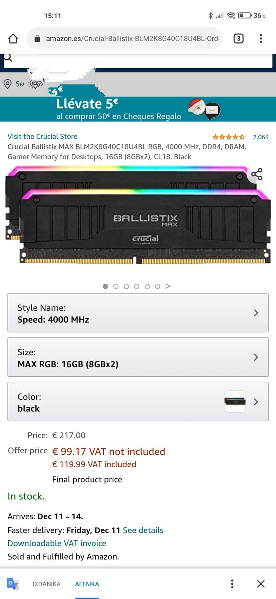 LaMereda Δημοσ. 27 Νοεμβρίου 2020 Δημοσ. 27 Νοεμβρίου 2020 Crucial Ballistix Max 16GB (2x8GB) DDR4-4000MHz (BLM2K8G40C18U4BL) Τελική τιμή 125.9€ από Amazon.es: https://www.amazon.es/Crucial-Ballistix-BLM2K8G40C18U4BL-Ordenadores-sobremesa/dp/B083VMZPJ8/ Skroutz από 205€ (χωρίς να υπολογίσουμε τυχόν μεταφορικά και διαθεσιμότητα): https://www.skroutz.gr/s/23048261/Crucial-Ballistix-Max-16GB-DDR4-4000MHz-BLM2K8G40C18U4BL.html 4 1