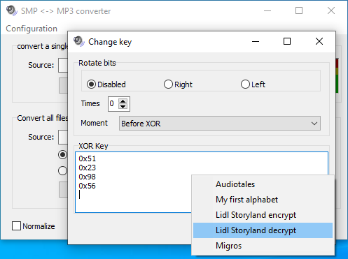 wizarde Δημοσ. 26 Ιανουαρίου 2021 Δημοσ. 26 Ιανουαρίου 2021 Στις 24/1/2021 στις 7:26 ΜΜ, mandos είπε κωδικοποιήσε το εσυ με το τροπο απο το github στο τραγούδι της κυριας Σαντα και βαλτο στο ηχειο μεσω usb 11 ώρες πριν, noasgr είπε Καλησπέρα και πάλι, επανέρχομαι με ένα update και ένα reminder 😅 Update: Το πρόγραμμα για μετατροπή από SMP σε MP3 (και το αντίστροφο) είναι πλέον συμβατό με το ηχείο και τα αρχεία του Lidl (και όχι μόνο). Τη νέα έκδοση θα τη βρείτε εδώ. 😉 Πως θα το χρησιμοποιήσετε: 1. Κατεβάζετε το zip και το αποσυμπιέζετε. 2. Τρέχετε το αρχείο Smp2Mp3 - Προσοχή: Την πρώτη φορά ίσως σας βγάλει warning για άγνωστο source. Επίσης θα σας ρωτήσει να διαλέξετε μεταξύ του eng.lan (για αγγλικά) και του spa.lan (για ισπανικά). Απόκρυψη περιεχομένων 3. Αφού ανοίξει το πρόγραμα ΣΗΜΑΝΤΙΚΟ ΒΗΜΑ! Πάτε configuration -> Change encryption key Απόκρυψη περιεχομένων 4. Στο παραθυράκι που θα ανοίξει, κάνετε δεξί κλικ στο "κενό" και επιλέγετε Lidl Storyland decrypt (για να μετατρέψετε SMP σε MP3) ή Lidl Storyland encrypt (για να μετατρέψετε κάποιο MP3 σε SMP). Εμφάνιση κρυμμένου περιεχομένου 5. Επιλέγουμε το αρχείο που θέλουμε να μετατρέψουμε και πατάμε convert. Εάν θέλουμε να κάνουμε "μαζική" μετατροπή χρησιμοποιούμε την επιλογή "Convert all files in a directory". Εμφάνιση κρυμμένου περιεχομένου Έξτρα επιλογές: Μπορείτε να ακούσετε το αρχείο πριν τη μετατροπή (είτε το smp είτε το mp3) καθώς και εάν θέλετε υπάρχει και η δυνατότητα να κάνετε normalize τα αρχεία. Αυτάααα. Ελπίζω να φανεί χρήσιμο σε όλους τους μπαμπάδες και μαμάδες του φόρουμ 🙃 Reminder: Δεν έχει κανείς τη συλλογή των audiotales στα ελληνικά; Όπως είπα και σε προηγούμενο post είμαι εξωτερικό και έχουμε την αντίστοιχη συλλογή εδώ αλλά μας ενδιαφέρει η μικρή να εξασκεί και την ελληνική.. Τα μόνα που βρήκα είναι αυτά εδώ, αλλά θα με ενδιέφεραν και τα υπόλοιπα SMP... 🙏 Ευχαριστώ και πάλι! μπραβο για τη δουλεια που εκανες!! αλλα εχω προβλημα. το αρχειο mp3 θελει καποια προετοιμασια πριν τη μετατροπη του σε smp μεσω της εφαρμογης? θα ψαξω να βρω τη συλλογη audiotales και θα σε ενημερωσω.. Στις 24/1/2021 στις 7:26 ΜΜ, mandos είπε κωδικοποιήσε το εσυ με το τροπο απο το github στο τραγούδι της κυριας Σαντα και βαλτο στο ηχειο μεσω usb δυστυχως δε βγαζω ακρη με την κωδικοποιηση γιατι δεν εχω ιδεα απο python. δοκιμαζω τoν τροπο που μας ειπε ο noas..