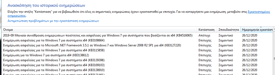 micos000 Δημοσ. 26 Δεκεμβρίου 2020 Δημοσ. 26 Δεκεμβρίου 2020 Με πρόλαβε ο snbblp. Δοκίμασε αυτά τα δύο kb. Σιγουρέψου ότι στήθηκε το 1ο σωστά πριν προχωρήσεις. http://download.windowsupdate.com/c/msdownload/update/software/secu/2019/03/windows6.1-kb4490628-x64_d3de52d6987f7c8bdc2c015dca69eac96047c76e.msu http://download.windowsupdate.com/d/msdownload/update/software/secu/2019/09/windows6.1-kb4516065-x64_40a6dff87423268e55a909d40a310ac66386be0d.msu 1