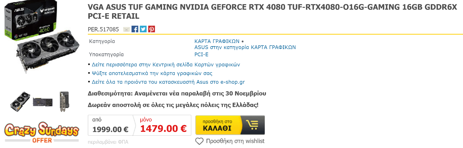 pirmen56 Δημοσ. 27 Νοεμβρίου 2022 Δημοσ. 27 Νοεμβρίου 2022 Νέα πτώση τιμή για την 4080 και σε ποιοτική υλοποίηση(1620€). Ενώ η φθηνότερη 4090 παραμένει στα 2270€. https://www.skroutz.gr/s/39470081/Asus-GeForce-RTX-4080-16GB-GDDR6X-TUF-Gaming-OC-Κάρτα-Γραφικών-PCI-E-x16-4-0-με-2-HDMI-και-3-DisplayPort-90YV0IB0-M0NA00.html