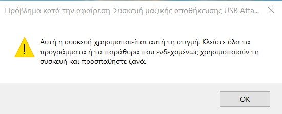 pavloa Δημοσ. 28 Δεκεμβρίου 2020 Δημοσ. 28 Δεκεμβρίου 2020 (επεξεργασμένο) Έχω εναν σκληρό δίσκο maxtor 1tb όποτε τον συνδέσω μετά δεν μπορώ να κάνω κατάργηση, μου βγάζει το παρακάτω μήνυμα. Μόνο με επανεκκίνηση μπορώ να κάνω κατάργηση. Τι μπορεί να φταίει? Επεξ/σία 28 Δεκεμβρίου 2020 από pavloa