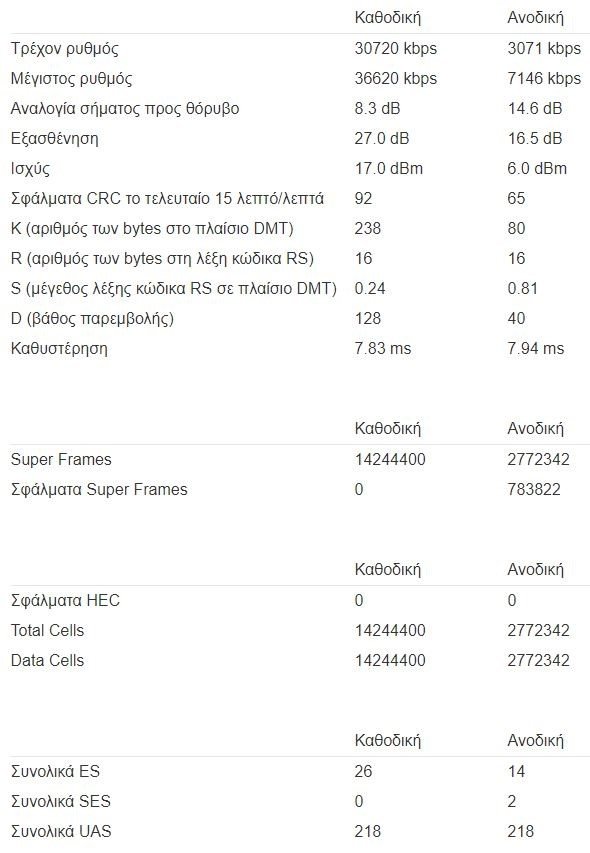 Rebirth Δημοσ. 8 Ιανουαρίου 2021 Μέλος Δημοσ. 8 Ιανουαρίου 2021 1 ώρα πριν, poulinos είπε αν συγχρονιζεις 30 και κατεβαζεις 10 ειναι θεμα παροχου συνηθως.οτι συγχρονιζεις 30 και οχι 50 μπορει να ειναι θεμα αποστασης αλλα μπορει να ειναι και θεμα καλωδιωσης. απλα πραγματα για να βγαλουμε μια ακρη.ποσα πριζακια τηλεφωνικα εχεις μεσα στο σπιτι σε ποια δωματια και που εχεις βαλει το ρουτερ.και η τηλεφωνια ειναι Voip ή κανονικη(tdm)? στην ουσια αυτο που θελουμε για αρχη ειναι να πας στο κεντρικο πριζακι που ειναι στο σαλονι συνηθως και να το ανοιξεις.απο πισω θα βρεις καποια ζευγαρια ενωμενα.εμεις θελουμε να μεινει στο πριζακι μονο ενα ζευγαρι ενωμενο και θα ειναι το ζευγαρι που θα κανει το ρουτερ σου να συγχρονισει στην σωστη ταχυτητα.αμα δεν συγχρονιζει εχεις παρει λαθος ζευγαρι.αμα συγχρονισει χαλια τοτε εχεις ενα σωστο καλωδιο και ενα λαθος.μετα βλεπουμε για διπλα πριζακια κτλ. Καλησπέρα και πάλι και ευχαριστώ ξανά. Λοιπόν αρχικά έχω 30αρα VDSL. Στο σπίτι έχω δύο πρίζες τελικά. Άφησα τo router με το splitter στην κεντρική πρίζα και έβγαλα το τηλ και το πήγα υπνοδωμάτιο (βάζοντας VDSL φίλτρο γιατί σε μια τηλεφωνική κλήση με πέταξε χθες). Κατά ένα περίεργο τρόπο σήμερα ως τώρα (φτου φτου) δεν είχα αποσυνδέσεις. Η ταχύτητα είναι στα 19-22 (δεν νομίζω ότι είχα πιάσει ποτέ παραπάνω). Οι τωρινές μετρήσεις είναι αυτές:
