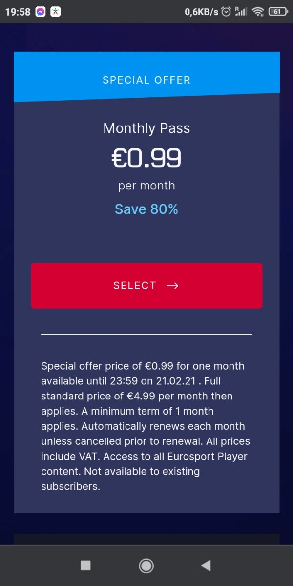bill27 Δημοσ. 5 Φεβρουαρίου 2021 Δημοσ. 5 Φεβρουαρίου 2021 (επεξεργασμένο) Ότι λέει ο τίτλος, μπαίνεις στο σάιτ Eurosport player και με 0,99€ βλέπεις για έναν μήνα.Μονο που ή προσφορά ίσχυει για νέους λογαριασμούς και έως 21/2.Σε αυτούς που έχουν παλιότερο λογαριασμό έρχεται μέιλ με λινκ για την προσφορά. Επεξ/σία 5 Φεβρουαρίου 2021 από bill27 4 2