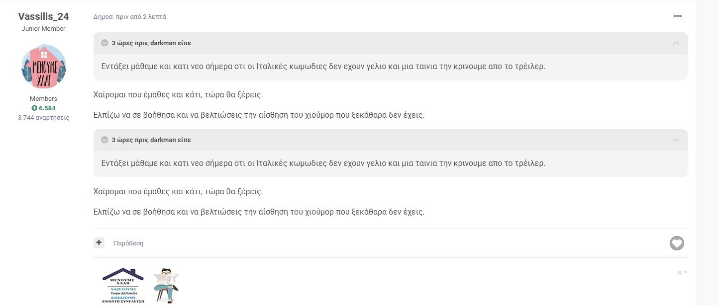 Vassilis_24 Δημοσ. 7 Μαρτίου 2021 Δημοσ. 7 Μαρτίου 2021 (επεξεργασμένο) 6 ώρες πριν, darkman είπε Εντάξει μάθαμε και κατι νεο σήμερα οτι οι Ιταλικές κωμωδιες δεν εχουν γελιο και μια ταινια την κρινουμε απο το τρέιλερ. Χαίρομαι που έμαθες και κάτι, τώρα θα ξέρεις. Ελπίζω να σε βοήθησα και να βελτιώσεις την αίσθηση του χιούμορ που ξεκάθαρα δεν έχεις. 6 ώρες πριν, darkman είπε Επεξ/σία 7 Μαρτίου 2021 από Vassilis_24 1