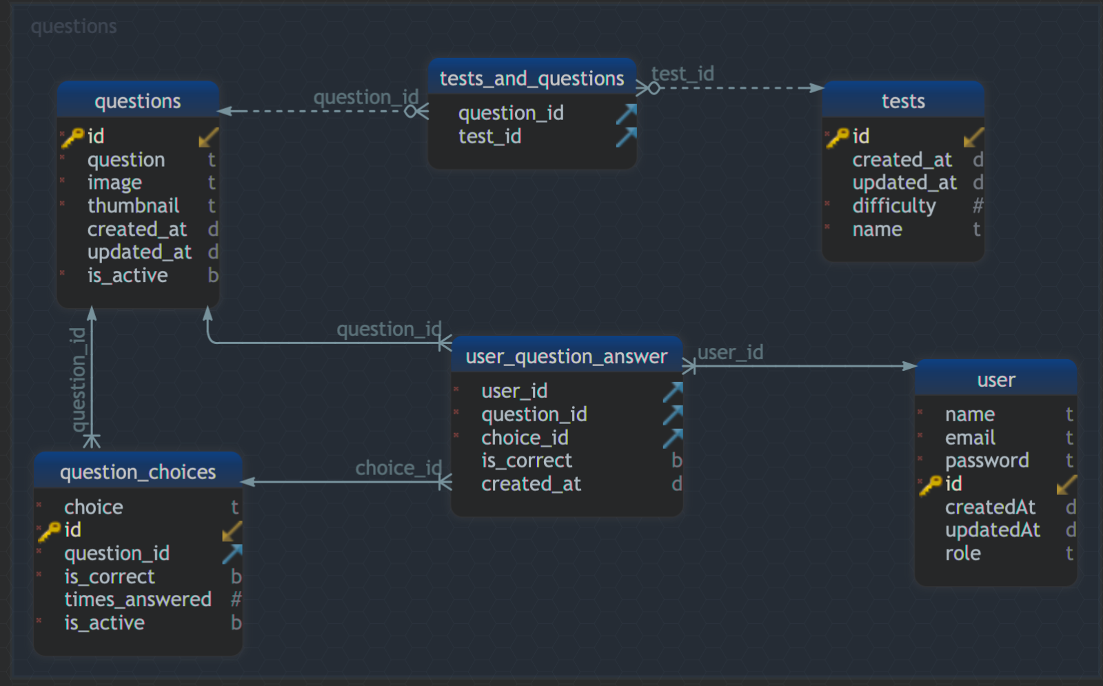 Predatorkill Δημοσ. 1 Μαρτίου 2021 Δημοσ. 1 Μαρτίου 2021 (επεξεργασμένο) Καλησπερα παιδες, θελω να φτιαξω ενα multiple choice quiz και εχω σκεφτει αυτο το schema, πιστευετε οτι ειναι ενταξει; θελω να το κανω οσο πιο robust γινεται και σκεφτομαι να βαλω και ιστορικο των τεστ, δηλαδη ο χρηστης να μπορει να δει το ιστορικο του ανα τεστ αλλα και σε ποιες ερωτησεις δυσκολευτηκε (την απαντησε πολλες φορες λαθος) ή οτι αλλο πιστευετε οτι μπορω να ενσωματωσω. επισης καλο θα ηταν να μαρκαρω ποιες ερωτησεις εχουν τις πιο πολλες λανθασμενες απαντησεις απο τους χρηστες ωστε να μπορω να δημιουργω ενα «δυσκολο» τεστ με βαση αυτες τις ερωτησεις. Η βαση θα ειναι postgresql 13. sql script: CREATE SEQUENCE "public".choice_id_seq START WITH 1; CREATE SEQUENCE "public".question_id_seq START WITH 1; CREATE SEQUENCE "public".test_id_seq START WITH 1; CREATE SEQUENCE "public".user_id_seq START WITH 1; CREATE TABLE "public".questions ( id bigint DEFAULT nextval('question_id_seq'::regclass) NOT NULL , question varchar(100000) NOT NULL , image varchar(5000) NOT NULL , thumbnail varchar(5000) NOT NULL , created_at timestamptz DEFAULT CURRENT_TIMESTAMP , updated_at timestamptz DEFAULT CURRENT_TIMESTAMP , is_active boolean DEFAULT true NOT NULL , CONSTRAINT pk_questions_id PRIMARY KEY ( id ) ); CREATE TABLE "public".tests ( id bigint DEFAULT nextval('test_id_seq'::regclass) NOT NULL , created_at timestamptz DEFAULT CURRENT_TIMESTAMP , updated_at timestamptz DEFAULT CURRENT_TIMESTAMP , difficulty integer DEFAULT 1 NOT NULL , name varchar(100) NOT NULL , CONSTRAINT pk_tests_id PRIMARY KEY ( id ) ); CREATE TABLE "public".tests_and_questions ( question_id bigint , test_id bigint ); CREATE TABLE "public"."user" ( name varchar(100) NOT NULL , email varchar(100) NOT NULL , "password" varchar(100) NOT NULL , id bigint DEFAULT nextval('user_id_seq'::regclass) NOT NULL , "createdAt" timestamptz DEFAULT CURRENT_TIMESTAMP , "updatedAt" timestamptz DEFAULT CURRENT_TIMESTAMP , "role" varchar(50) DEFAULT 'USER'::character varying , CONSTRAINT pk_users_id PRIMARY KEY ( id ) ); CREATE TABLE "public".question_choices ( choice varchar(5000) NOT NULL , id bigint DEFAULT nextval('choice_id_seq'::regclass) NOT NULL , question_id bigint NOT NULL , is_correct boolean DEFAULT false NOT NULL , times_answered bigint , is_active boolean DEFAULT true NOT NULL , CONSTRAINT pk_question_choices_id PRIMARY KEY ( id ) ); CREATE TABLE "public".user_question_answer ( user_id bigint NOT NULL , question_id bigint NOT NULL , choice_id bigint NOT NULL , is_correct boolean , created_at timestamptz DEFAULT CURRENT_TIMESTAMP ); ALTER TABLE "public".question_choices ADD CONSTRAINT fk_question_choices_questions FOREIGN KEY ( question_id ) REFERENCES "public".questions( id ); ALTER TABLE "public".tests_and_questions ADD CONSTRAINT fk_tests_and_questions_questions FOREIGN KEY ( question_id ) REFERENCES "public".questions( id ); ALTER TABLE "public".tests_and_questions ADD CONSTRAINT fk_tests_and_questions_tests FOREIGN KEY ( test_id ) REFERENCES "public".tests( id ); ALTER TABLE "public".user_question_answer ADD CONSTRAINT fk_user_question_answer_question_choices FOREIGN KEY ( choice_id ) REFERENCES "public".question_choices( id ); ALTER TABLE "public".user_question_answer ADD CONSTRAINT fk_user_question_answer_questions FOREIGN KEY ( question_id ) REFERENCES "public".questions( id ); ALTER TABLE "public".user_question_answer ADD CONSTRAINT fk_user_question_answer_users FOREIGN KEY ( user_id ) REFERENCES "public"."user"( id ); Επεξ/σία 1 Μαρτίου 2021 από Predatorkill