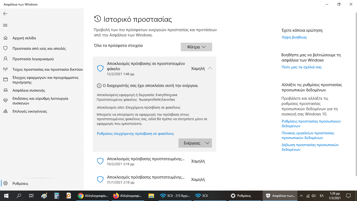 Gigiloni Δημοσ. 3 Μαρτίου 2021 Δημοσ. 3 Μαρτίου 2021 Πηγαίνοντας Ασφάλεια windows-->Προστασία από ιούς και απειλές-->ιστορικό προστασίας εμφανίζει ένα ιστορικό που λέει Αποκλεισμός πρόσβασης σε προσταυτευόμενο φάκελο και λίγο παρακάτω ότι ''ο διαχειριστής σας έχει αποκλείσει αυτήν την ενέργεια'' Έχει καταφέρει κανείς να διαγράψει το ιστορικό αυτό με κάποιο τρόπο;