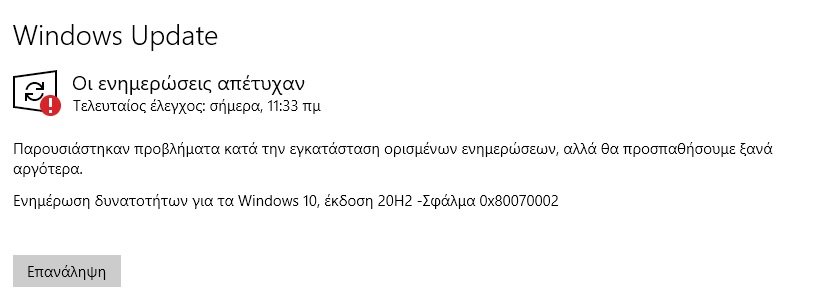rafinos Δημοσ. 16 Μαρτίου 2021 Δημοσ. 16 Μαρτίου 2021 Γεια σας παιδιά! Από χθες μου βγάζει αυτό το error κάπου στο 30% (ίσως λίγο παραπάνω) κατά την εγκατάσταση της ενημέρωσης. Ξέρει κανείς τι μπορεί να φταίει; Το έψαξα με τον κωδικό σφάλματος, δοκίμασα να κάνω διορθώσεις με το εργαλείο των windows στο windows update βρήκε κάποιο σφάλμα και μου πρότεινε να ξαναδοκιμάσω το update αλλά τίποτα.