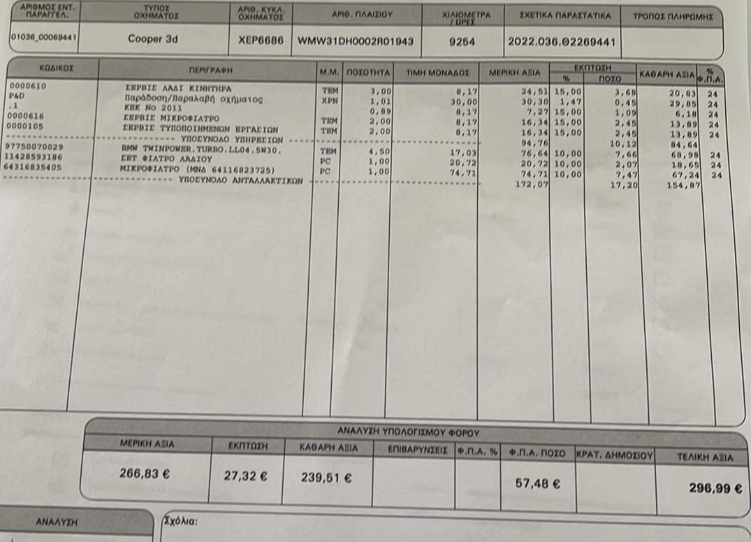 paylidis Δημοσ. 9 Ιουνίου 2022 Δημοσ. 9 Ιουνίου 2022 16 ώρες πριν, mp123 είπε Ετσι πληροφοριακα παραθετω τιμες σερβις του μινι. Το αμαξι ειχε 9500 σε ενα χρονο. Πηρα τηλ για σερβις κσι μου λενε φερτο στις 20000χλμ. Δλδ με την χρηση που του κανουμε βγενει σε δυο χρονια. Εγω ειμαο τις παλιας σχολης θελω καθε χρονο. Επειδη λειπω και η γυναικα δεν ξερει να το παει κανονισαμε delivery. Με λιγα λογια λαδια ,φιλτρο λαδιου, φιλτρο καμπινας ελεγχος 260 ευρω συν 35 ευρω το delivery. Οκ 260 καλα ειναι. Για το σουιφτ ειχα δωσει 180 για τα ιδια . Οταν κανανε τον ελεγχο στειλανε βιντεο και μια λιστα που κανουν τσεκ αν θελει αλλαγη. Το αμαξι ηταν αψογο ουτε γρατσουνια. Ασ λενε οτι θελουν εγω ευχαριστημενος ειμαι απο το σερβις στον σφακιανακη αναλυτικοτατοι , μεχρι κσι βιντεο στειλανε. 260 πολυ κσλα ειναι . Για BMW (γιατι το ιδιο πραγμα ειναι με το ΜΙΝΙ) ειναι σχετικά καλα... Τα ιδια θα ειναι πρακτικα και τα 116/118 μιας και μιλάμε ακριβως για το ιδιο μοτερ. Ενδεχομένως αν ειχες ορεξη να το εριχνες κανενα πενηνταρικο αλλα πεντε πανω πεντε κατω δε σώνεσαι... Θα δωσω κ εγω ακριβές Feedback σε 3 εβδομάδες που εχω το 2ο σερβις (που θα εχει και φιλτρο καμπινας και υγρα φρενων) - καπου 240-250 πρεπει να ειμαι ομως με την έκπτωση που εχω... 2