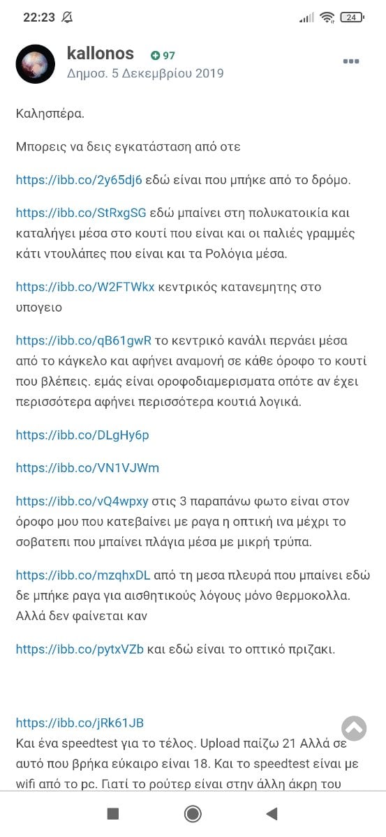 Θοδωρής005 Δημοσ. 22 Μαΐου 2021 Μέλος Δημοσ. 22 Μαΐου 2021 18 λεπτά πριν, ikorolis είπε Αγαπητέ θοδωρή τα πράγματα είναι απλά υπάρχει κανονισμός , υπάρχει χρονοδιάγραμμα Αν στην πολυκατοικία που μένει ο γνωστός σου δεν έχει γίνει εγκατάσταση οπτικών ινών (FTTH) από κάποιον άλλον ώστε να μπουν όλος ο απαραίτητος εξοπλισμός που αναφέραμε στα προηγούμενα μηνύματα δεν υπάρχει καμία περίπτωση να γίνει εγκατάσταση οπτικών ινών στον γνωστό σου σε ένα μήνα , ο εναλλακτικός τρόπος που υπάρχει είναι ο γνωστός σου να είναι επαγγελματίας/επιχείρηση/εταιρεία και να έβαλε μισθωμένη γραμμή οπτικών ινών και να πλήρωσε. Ξέρεις όμως τι πηρα τηλεφωνο στην wind και ενημερωθηκα τι έχει γίνει και μου είπαν οι οπτικές ίνες έχουν συνδεθεί με την πολυκατοικια και το μόνο που χρειάζεται είναι να έρθει από το ισόγειο στο διαμέρισμα μου και μου ότι επειδή στην περιοχη δεν υπάρχει πολλη από το συνεργείο της μου είπε ότι αυτό μπορεί να γίνει σε διάστημα έως και 1 μηνα
