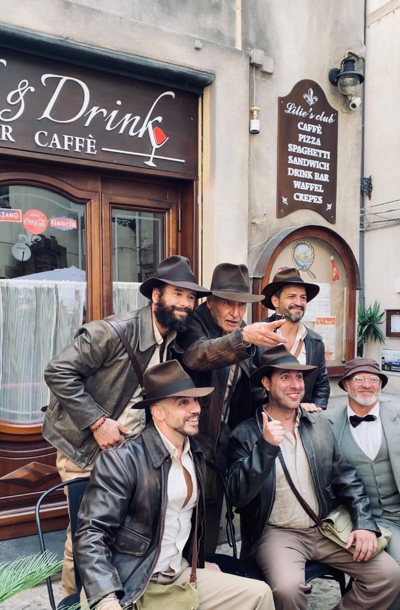 mecanomecano Δημοσ. 20 Οκτωβρίου 2021 Δημοσ. 20 Οκτωβρίου 2021 Harrison Ford poses as Indiana Jones with lookalike fans dressed as the movie's iconic explorer Με Antonio Banderas και Phoebe Waller-Bridge στην Σικελια 5