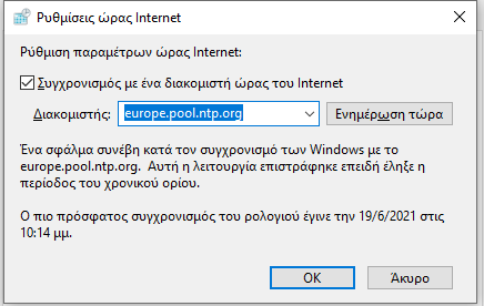 snbblp Δημοσ. 19 Ιουνίου 2021 Δημοσ. 19 Ιουνίου 2021 1 ώρα πριν, thanosts2000 είπε Εδώ και 2 μήνες κοντά δεν μπορώ να κάνω συγχρονισμό στην ώρα του υπολογιστή με αποτέλεσμα να χάνω λεπτά σε σχέση με την πραγματικότητα. Δοκίμασα τα πάντα από δω αλλά το πρόβλημα ακόμα εκεί. Το μήνυμα που μου βγάζει είναι "An error occurred while Windows was synchronizing with time.windows.com. The peer is unreachable.". Καμία ιδέα για το τι άλλο θα μπορούσα να δοκιμάσω? Αλλαξε σε time.nist.gov