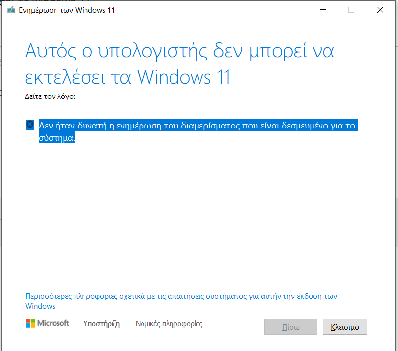 costas20023 Δημοσ. 1 Ιουλίου 2021 Δημοσ. 1 Ιουλίου 2021 Δεν ήταν δυνατή η ενημέρωση του διαμερίσματος που είναι δεσμευμένο σε αυτό το σύστημα μου εμφανίζει ενώ μπορώ κανονικά να εγκαταστήσω τα windows 11.