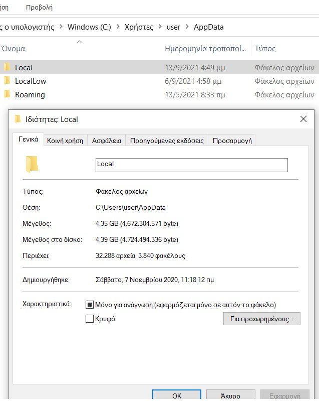 tzitzikas2 Δημοσ. 13 Σεπτεμβρίου 2021 Μέλος Δημοσ. 13 Σεπτεμβρίου 2021 (επεξεργασμένο) σημερα κατέβηκε 1gb ακόμα και πήγε στα 153gb χωρίς να γίνει κάποιο update σε windows 10 ή σε κάποιο πρόγραμμα. Πέρα απο να κάνω κάποια εκκαθάριση, υπάρχει κάποιος τρόπος αρχικά να τσεκάρω μήπως υπάρχει πρόβλημα άλλο (π.χ ιός).? Χτες έτρεξα το defender αλλά δεν βρήκε κάτι. Ευχαριστώ edit: ο κρυφός φάκελος Local>AppData στην θέση windows C > Χρήστες> user > AppData καταλαμβάνει 4,35gb και φαίνεται να έχει επεξεργαστεί και σήμερα. Ειναι οκ? Επεξ/σία 13 Σεπτεμβρίου 2021 από tzitzikas2
