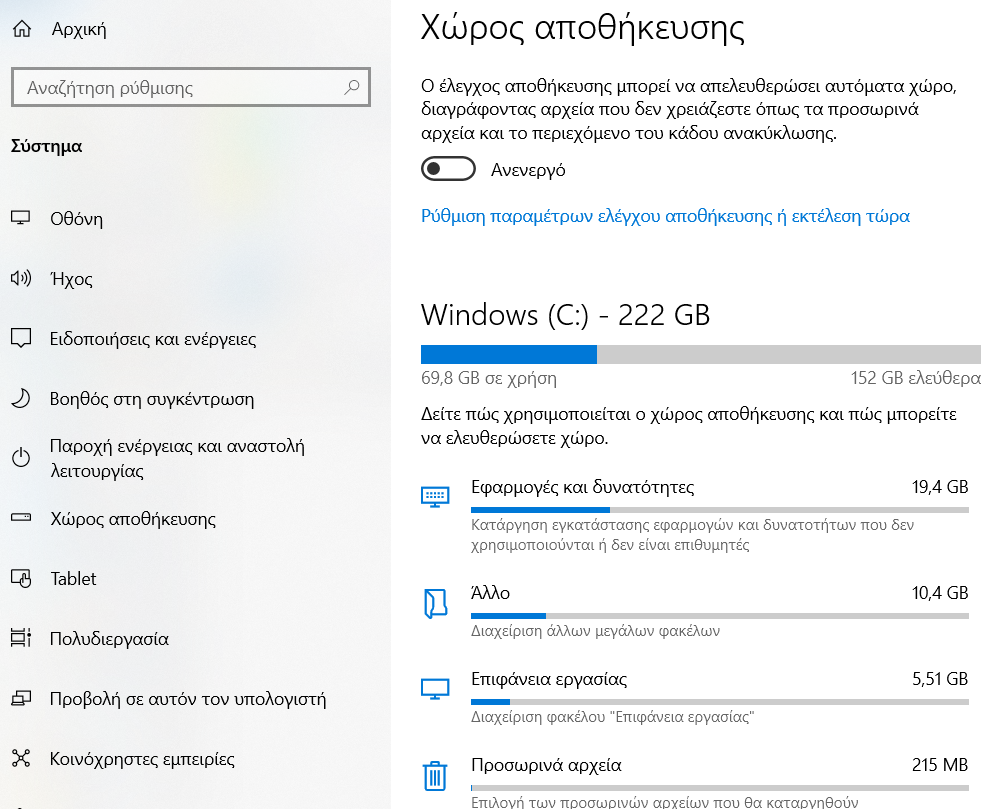 tzitzikas2 Δημοσ. 11 Σεπτεμβρίου 2021 Δημοσ. 11 Σεπτεμβρίου 2021 καλησπέρα. Εχω έναν SSD (καθαρά 222GB) όπου μέσα έχω τα windows 10, office, autocad 2017 και μερικά ακόμα προγράμματα τα οποία δεν πιάνουν πολύ χώρο. Γενικά δεν περνάω άλλα προγράμματα. Κανονικά κάνω τα windows update, και τώρα είναι εγκατεστημένη η έκδοση Windows 10 Home 21H1 64bit. Ελεύθερα μου δείχνει 154GB/222GB. Χτές μου έδειχνε ελεύθερα 155GB, και χωρίς να γίνει κάποιο windows update μέχρι σήμερα ή οποιοδήποτε update σε κάποιο πρόγραμμα, σήμερα έχει μειωθεί ο ελεύθερος χώρος κατα 1GB. Για ποιο λόγο να έγινε αυτό? Λίγο με αγχώνει ο χώρος μην αρχίσει και γεμίζει και μετά σέρνεται το σύστημα. Ποια η γνώμη σας, για πιο λόγο συμβαίνει και θα ήθελα να ρωτήσω αν θα χάνω συνεχώς GB απο τον ελεύθερο χώρο και χωρίς να περνάω αλλα προγράμματα. Ευχαριστώ!