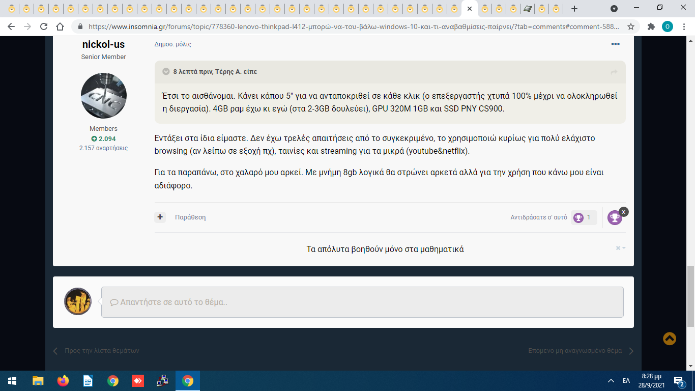 micos000 Δημοσ. 28 Σεπτεμβρίου 2021 Δημοσ. 28 Σεπτεμβρίου 2021 Για επεξεργαστή δες στο παρακάτω λινκ. Βλέπω πάει μέχρι i7-620M. https://support.lenovo.com/us/en/solutions/migr-73415 Πάντως για browsing και ταινίες, μήπως να κοιτούσες τίποτα σε linux (mint, ubuntu κτλ); Για windows δοκίμασε και τα 8.1 1