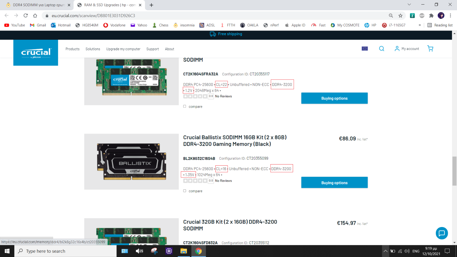 GATE123 Δημοσ. 12 Οκτωβρίου 2021 Δημοσ. 12 Οκτωβρίου 2021 1 ώρα πριν, PeggyV είπε Εχουμε σε 1 Laptop απο την αγορα αυτες 2 x 8Gb SAMSUNG K4AAG165WA-BCWE 3200Mhz DDR4 SODIMM 24-22-22-52 και θελουμε να βαλουμε αυτες G-SKILL F4-3200C16D-16GRS 16-18-18-43 που εχουν χαμηλοτερο latency και την ιδια ονομαστικη ταχυτητα. Στο site της G-SKILL τις δειχνει ως 1.2V , και στο information δηλωνει οτι πρεπει να εχουν XMP για να δουλεψουν. https://www.gskill.com/specification/2/197/1540866230/F4-3200C16D-16GRS-Specification Αυτες που εχει το Laptop τωρα στο Typhoon Burner τις εχει με 1.2V και στο Τask Manager τις διαβαζει 3200Mhz, στο CPU-Z δειχνει στο SPD τα latency οπως και στο Typhoon Burner Υπαρχει μνημη 3200Mhz στα 1.2 απο stock (αυτες του laptop δηλαδη) και οι αλλες να θελουν 1.35V και επιλογη XMP στο BIOS (επιλογη που δεν εχει το συγκεκριμενο) Τελος αν δεν ειναι συμβατες και δουλεψουν στα 2133Mhz , το latency λογικα θα πεσει στον πατο... απο εκει θα υπαρχει καλητερη η χειροτερη αποδοση απο τα 3200Mhz με 24-22-22-52 ??? ευχαριστω για οποια απαντηση δωσετε. Τρέξε αυτό το πρόγραμμα και θα δεις πια είναι συμβατή https://www.crucial.com/content/dam/crucial/support/scan/downloads/CrucialScan.exe