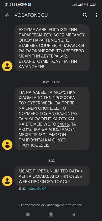 Επισκέπτης Δημοσ. 8 Δεκεμβρίου 2021 Δημοσ. 8 Δεκεμβρίου 2021 Εγώ ήμουν μια χαρά από την προηγούμενη Δευτέρα που ενεργοποίησα την κάρτα έως σήμερα το μεσημέρι που μου ήρθε ένα sms για τα unlimited και από τότε dead , καθόλου internet 😫 αν δεν μου στείλουν τα ακουστικά θα γίνει ο χαμός