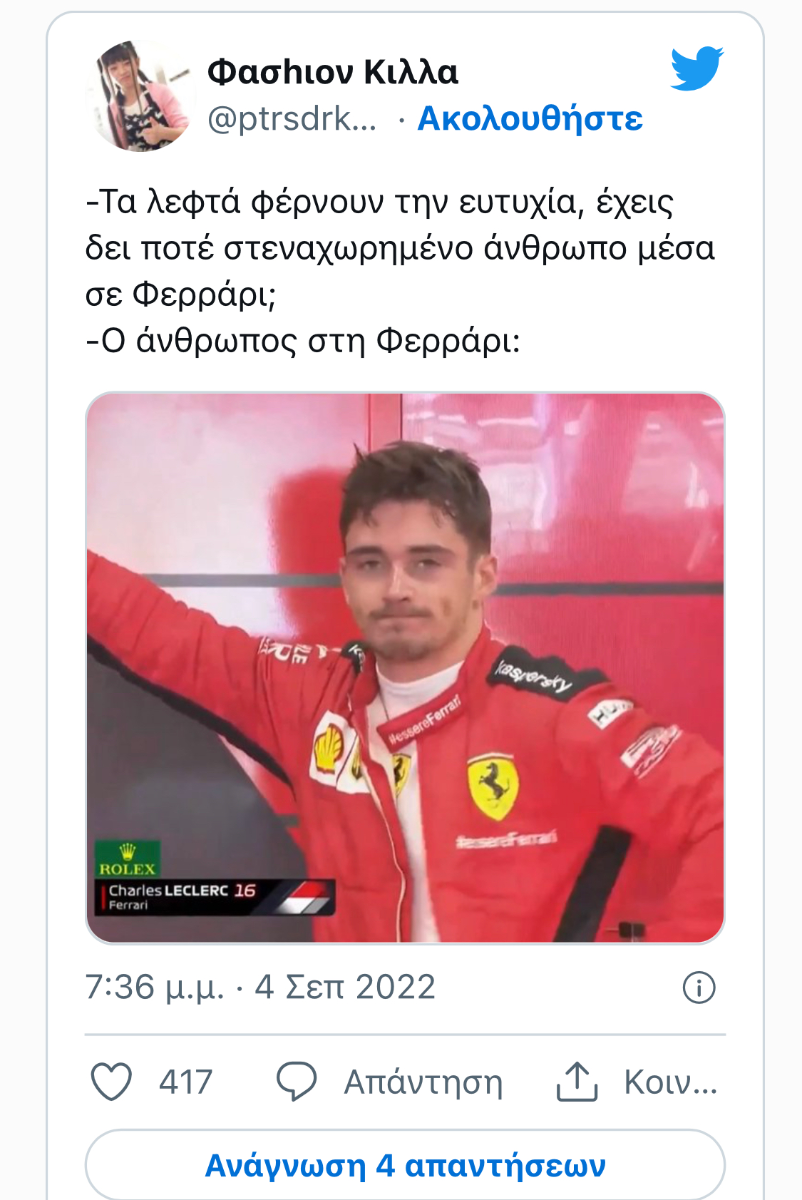 mandos Δημοσ. 5 Σεπτεμβρίου 2022 Δημοσ. 5 Σεπτεμβρίου 2022 1 ώρα πριν, primeragt είπε Τα πήρε με τρομερή ευκολία έναντι του ανταγωνισμού Και εκεί χαρήκαμε όλοι φέτος στις αρχές, οποία ομάδα και να στηρίζαμε, γιατί στιγμιαία φάνηκε ότι θα έχει ανταγωνισμό. Η Η αλήθεια είναι ότι πραγματικά θα είχε, αν η Φεράρι δεν γινόταν ρεντικολο όλο και περισσότερο κάθε ΣΚ. Νομίζω, πέρα από την πλάκα και τα πειράγματα, κάνεις δε θέλει να δει πρωτάθλημα να τελειώνει στη Σιγκαπούρη, ούτε την RBR με διπλάσιους πόντους από τη μερκ (η φοράδα θα είναι τρίτη). Θέλουμε το 2007->2011. 12(+1) χρόνια τώρα το πρωτάθλημα παίζει μεταξύ RBR ή Μερκ. Και αυτό μονότονο είναι. Το πρόβλημα βέβαια δεν είναι αυτές οι δύο, είναι ξεκάθαρα οι άλλες οκτώ... 3