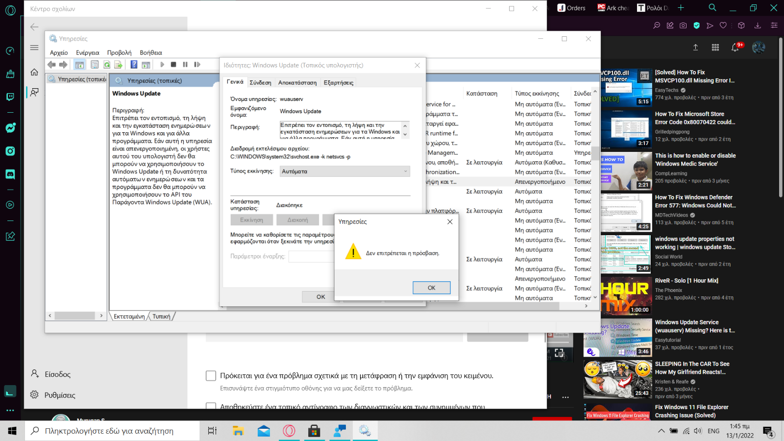 alexandros010 Δημοσ. 13 Ιανουαρίου 2022 Δημοσ. 13 Ιανουαρίου 2022 Δεν μπορω να ενεργοποιησω το Windows update. Εχω δοκιμαση να κανω ενεργοποιηση μεσω υπηρεσιων αλλα μου λεει "δεν επιτρεπεται η προσβαση" ακομη και με ενεργη υπηρεσια BItS. Εχει κανεις καμια ιδεα τι φταιει ;