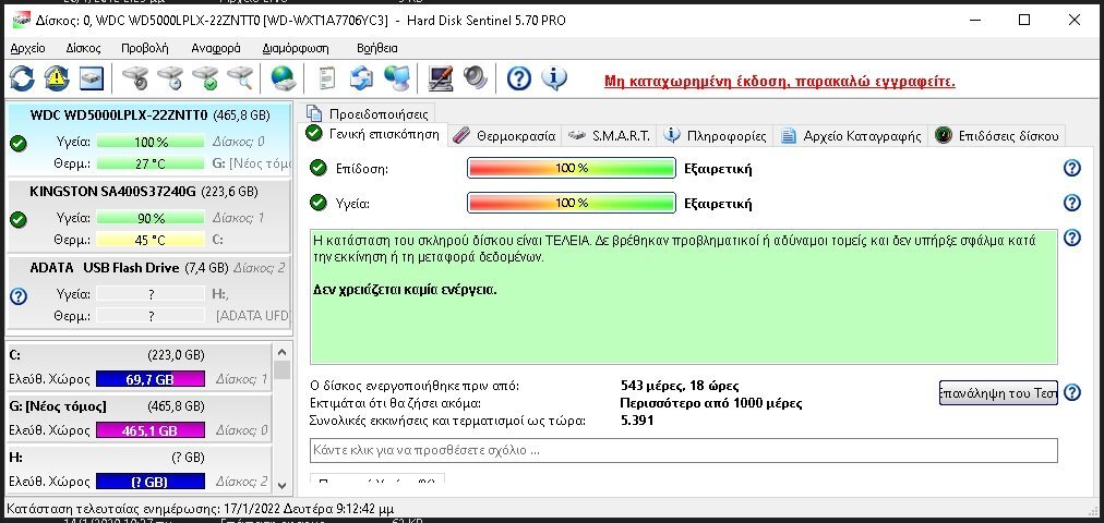 TopCLR Δημοσ. 18 Ιανουαρίου 2022 Δημοσ. 18 Ιανουαρίου 2022 Στο HDSentinel κάνε κλικ στον Kingston και βάλε printscreen. Αυτό που έβαλες δείχνει για τον HDD 500GB που έχεις για δεύτερο (πάντως φαίνεται εντάξει). Μια παρατήρηση: Παρόλο που έχεις δεύτερο δίσκο σαν αποθήκη (G: Νεος τόμος) τον έχεις σχεδόν άδειο ενώ ο βασικός δίσκος συστήματος (C:) είναι αρκετά γεμάτος. Σε σημείο μάλιστα (περίπου 25% ελεύθερος χώρος) που θα πρέπει να μην τον γεμίσεις παραπάνω για να μην επηρεάζεται η ταχύτητα του δίσκου (Τους SSD καλό είναι να τους έχουμε τουλάχιστον 25-30% άδειους για να μην πέφτει η ταχύτητά τους). Ένα άλλο είναι η θερμοκρασία του SSD (45 βαθμοί) που είναι αρκετά "τσιμπημένοι" (ενώ αντιστρόφως, ο σκληρός είναι δροσερός στους 27). Η συχνότητα στις μνήμες λογικά με την αφαίρεση της μνήμης 2GB θα γίνει αυτόματα 1333Mhz. θα μπορούσες να την βάλεις στα 1600 αλλά δεν γνωρίζω σίγουρα κατα πόσο θα βελτιώσει το σύστημα (μάλλον θα έχει ελάχιστο κέρδος) και αν αξίζει να παιδευτείς για να ψάξεις και την σταθερότητα σε αυτήν την συχνότητα.