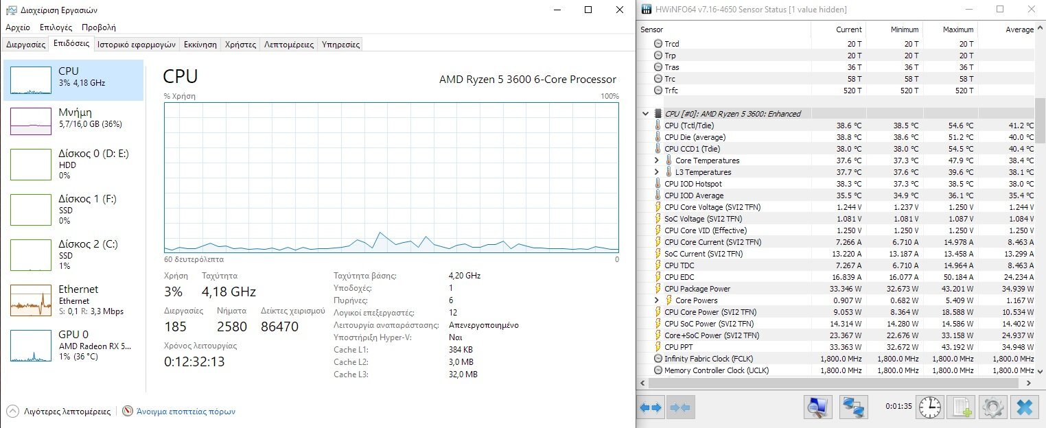 kostaskiou Δημοσ. 9 Φεβρουαρίου 2022 Μέλος Δημοσ. 9 Φεβρουαρίου 2022 8 ώρες πριν, raul7 είπε και πάλι πολλοί είναι οι 88 κάτι δεν πάει καλά, ή το σύστημα δεν είναι idle και κάνει κάτι πολύ βαρύ, ή έχεις θέμα με την ψύκτρα. Αν μπορείς βγάλε ένα screenshot όπως αυτό που έχω εγώ, να φαίνεται η διαχείριση εργασιών με το φορτίο και δίπλα τα sensors του hwmonitor στο σημείο του επεξεργαστή. Και η ψύκτρα να μην είναι καλή και το κoυτί να μην είναι το ιδανικό, θα έπρεπε να έχεις τουλάχιστον 30c-40c κάτω σε idle.. Δηλαδή idle 35-55, load 65-80 θα έλεγα ότι είναι αποδεκτά και αυτό πάλι σε περίπτωση που κάνεις κάτι απαιτητικό ή σε gaming που ανεβαίνουν οι θερμοκρασίες παραπάνω και λόγω της κάρτας. 88c με idle ή μικρό φορτίο είναι πρόβλημα. Επίσης το ανεμιστηράκι είναι σημαντικό να φυσάει με φορά προς τα πάνω για να φεύγει ο ζεστός αέρας από το κουτί. Ένας ανεμιστήρας στο πάνω μέρος του κουτιού που θα βγάζει κι αυτός προς τα έξω επίσης θα βοηθούσε. Αν δεν ειναι αυτο πες μου 5 ώρες πριν, ICE-T είπε chipset drivers and amd drivers εχεις περασει? Επειδη δεν ειμαι σιγουρος υπαρχει πουθενα που μπορω να το δω αυτο?