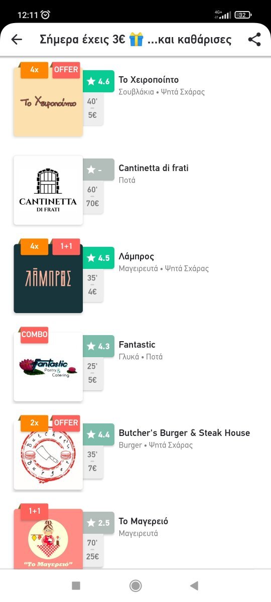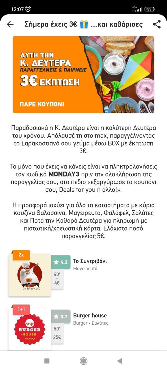 stelaras12 Δημοσ. 7 Μαρτίου 2022 Δημοσ. 7 Μαρτίου 2022 Κωδικός MONDAY3 και έχετε 3€ έκπτωση για καταστήματα με κύρια κουζίνα θαλασσινά, σαλάτες, μαγειρευτά, φαλάφελ, ποτά. Μην ξενερώνετε γιατί όπως βλέπετε στη φωτογραφία ισχύει και για μαγαζιά που έχουν burger στην περιοχή μου που έχουν τις σαλάτες σαν κατηγορία. 4 2
