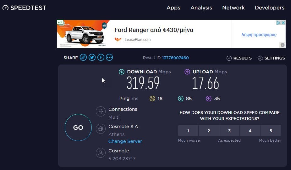 ΠάρηςΓ Δημοσ. 19 Οκτωβρίου 2022 Δημοσ. 19 Οκτωβρίου 2022 21 ώρες πριν, flyer είπε Upload έχω συνήθως 30-110 σε σταθερό σημείο τοποθέτησης. Στον υπολογιστή έχω παρόμοιες μετρήσεις με το κινητό.. Όλες οι συσκευές μου είναι apple... Το σκεφτομαι και εγω αλλα καθως το σπιτι μου εχει 3 οροφους θελω να χρησιμοποιησω το καλωδιο. Με το κινητο πιανω down 600mbps. Γραφει πως παιρνει κεραια δε ξερω αν ισχυει.