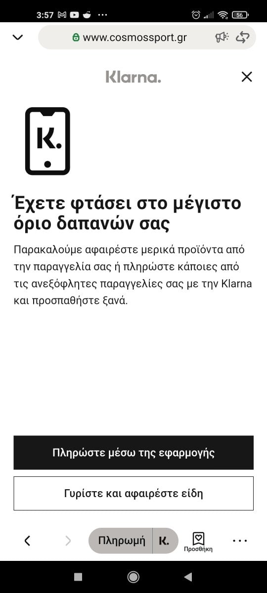 kormos Δημοσ. 4 Σεπτεμβρίου 2022 Δημοσ. 4 Σεπτεμβρίου 2022 7 ώρες πριν, Matthewkats είπε Καλησπέρα! Μπορεί κάποιος να μου απαντήσει γιατί όταν προσπαθώ να κάνω την πρώτη μου αγορά από το Klarna μου βγάζει το παρακάτω πρόβλημα παρά το γεγονός ότι δεν έχω ξαναγοράσει ούτε έχω ανεξόφλητες παραγγελίες; Στο αναγράφει... Υπάρχει όριο και το έχεις υπερβεί. Υπάρχει νήμα που γίνονται αναφορές για το περιεχόμενο αυτό παρακάτω Μφχ