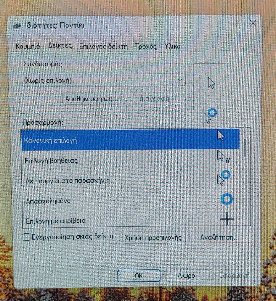 Τέρης Α. Δημοσ. 19 Ιουνίου 2022 Δημοσ. 19 Ιουνίου 2022 (επεξεργασμένο) Στις 19/6/2022 στις 11:05 ΠΜ, George! είπε Καμιά ιδέα; Μήπως κάποιος έβαλε το δείκτη να δείχνει έτσι; Υπάρχει τέτοια ρύθμιση στο: Πίνακας ελέγχου> Υλικό και ήχος> Συσκευές και εκτυπωτές> Ποντίκι Επεξ/σία 23 Ιουνίου 2022 από Τέρης Α.