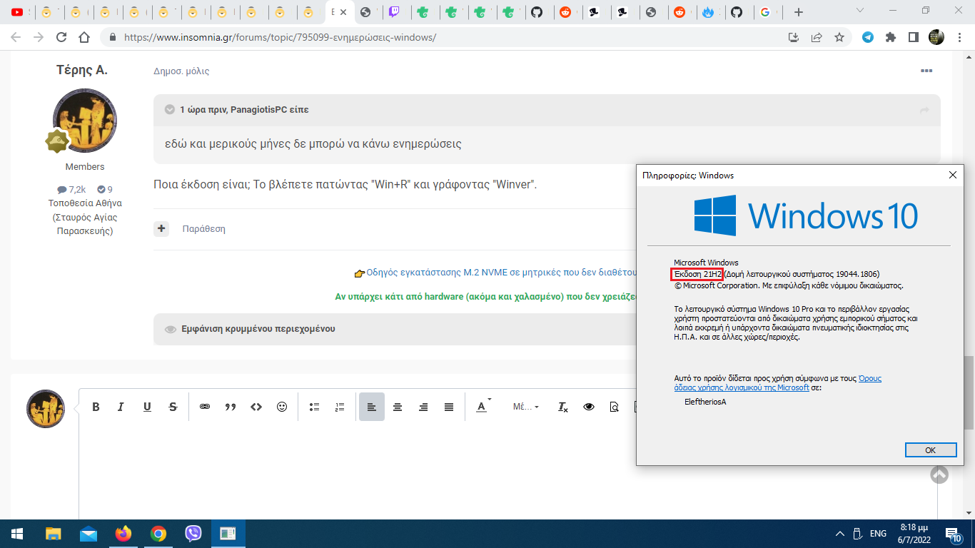 Τέρης Α. Δημοσ. 6 Ιουλίου 2022 Δημοσ. 6 Ιουλίου 2022 1 ώρα πριν, PanagiotisPC είπε εδώ και μερικούς μήνες δε μπορώ να κάνω ενημερώσεις Ποια έκδοση είναι; Το βλέπετε πατώντας ''Win+R'' και γράφοντας ''Winver''. Spoiler
