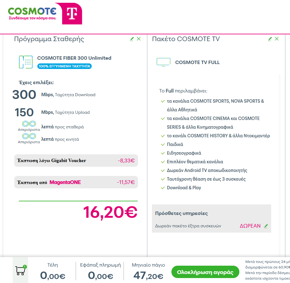 Spyrito33 Δημοσ. 25 Σεπτεμβρίου Δημοσ. 25 Σεπτεμβρίου 23 λεπτά πριν, jkoukos είπε Αναφέρεστε σε ανόμοια πράγματα. Ναι μεν έχετε την ίδια σύνδεση αλλά στην μία υπάρχει το απλό Cosmote TV Entry που το δίνει δωρεάν αυτή την περίοδο σε κάποια πακέτα ενώ η άλλη το Full TV. Ενδεικτικά το Entry μόνο του έχει 9€ ενώ το Full 31€. δηλαδη εσυ το βλεπεις λογικο να μου δινει το Magenta απο μονο του στο site αυτα εδω και να μου κανουν ''προσφορα'' 2 ευρω ποιο ακριβα απο το να το κανω μονος μου απλα πατωντας κουμπακια? οριστε δεν λεω ψεματα.