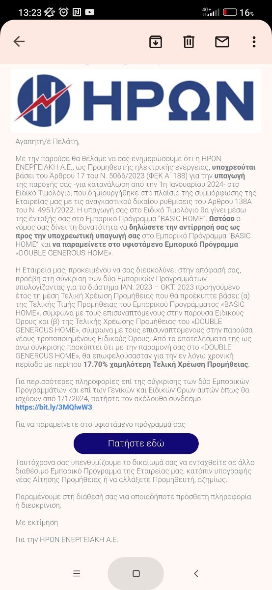 Καλησπέρα κι από εμένα. Εγώ είμαι στο Guarantee Home κι έχω επιλέξει και την προστασία τιμής Guarantee +8 ευρώ/μήνα. Δεν μου έχει έρθει καμία ενημέρωση από ΗΡΩΝ προς το παρόν για το τι θα ισχύει για εμένα από αρχές του χρόνου, όπως βλέπω ότι έχει έρθει στους περισσότερους.